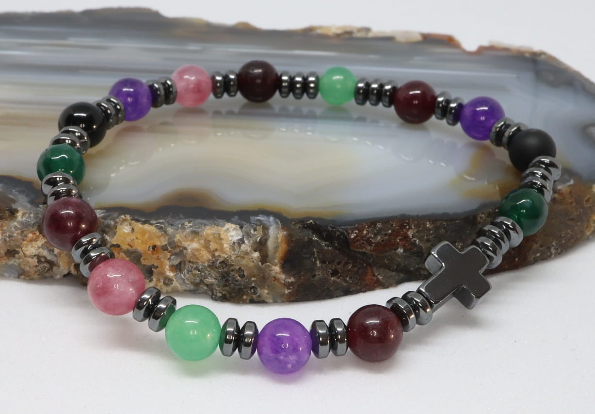 Różaniec wykonany jest z miksu różnych, kolorowych kamieni : - nefryt, granat, onyks, jadeit, ametyst, hematyt.