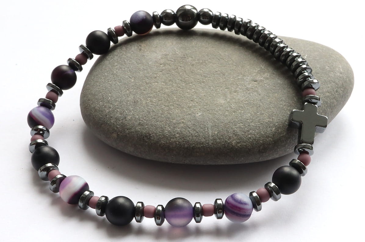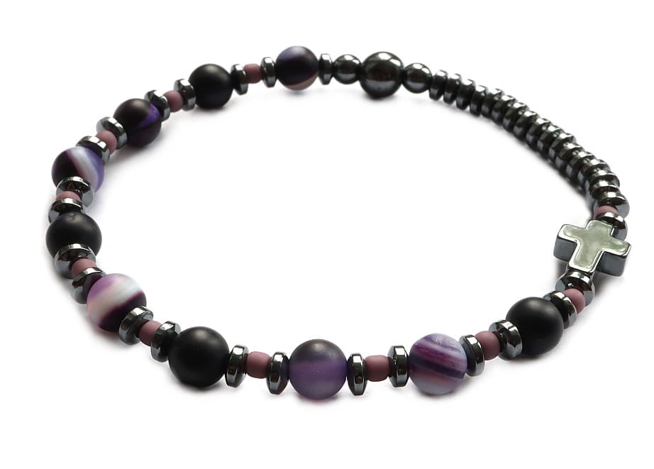 Różaniec wykonany z kamieni matowych agatów /wielkość 6mm/ w odcieniach fioletu, drobnych wrzosowych koralików Toho, oraz hematytu w kolorze antracytowym.