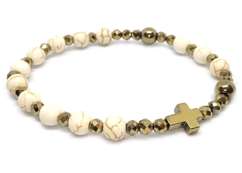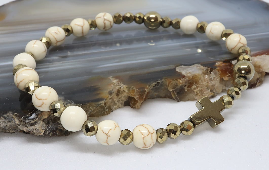 Ta wyjątkowa bransoletka to harmonijne połączenie dwóch kamieni: howlitu kremowego żyłkowego i złotego, fasetowanego hematytu. Kamienie o średnicy 6 mm i 4 mm (hematyt) tworzą unikalny wzór, który przyciąga wzrok. Całość została osadzona na mocnej gumce jubilerskiej, dzięki czemu bransoletka doskonale dopasowuje się do nadgarstka. Rozmiar na zdjęciu pasuje na nadgarstek ok 17cm - na życzenie możemy wykonać inny obwód.