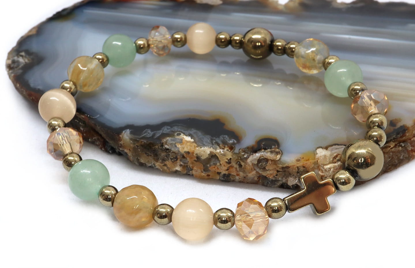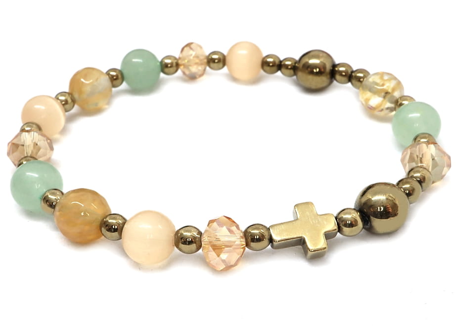 Ten ręcznie wykonany różaniec na rękę to propozycja dla osób, które szukają biżuterii o głębokim znaczeniu, a jednocześnie cenią sobie nowoczesny i lekki design. Dzięki zastosowaniu jasnych, pastelowych odcieni zieleni, beżu, złota, różaniec staje się pięknym dopełnieniem codziennego stroju.