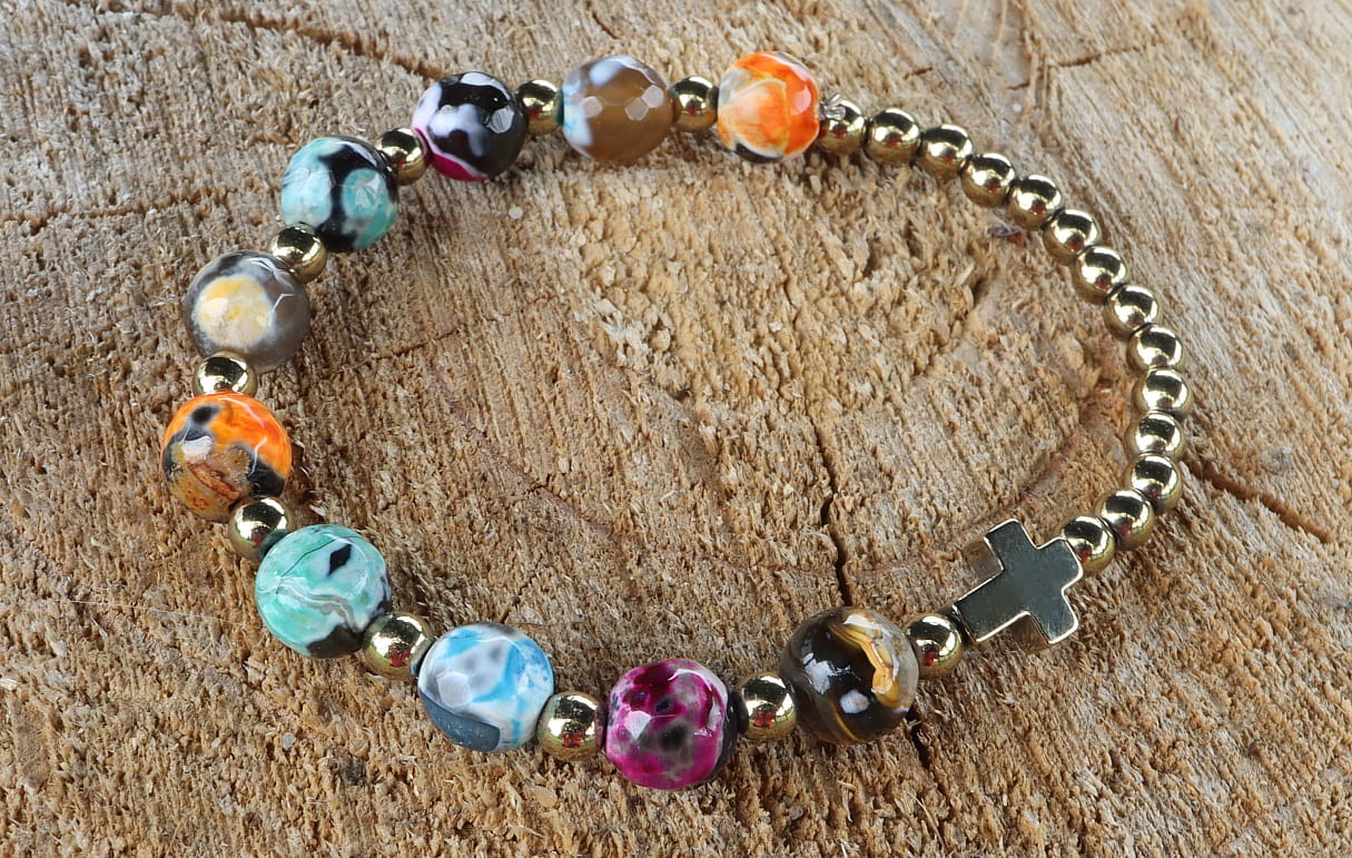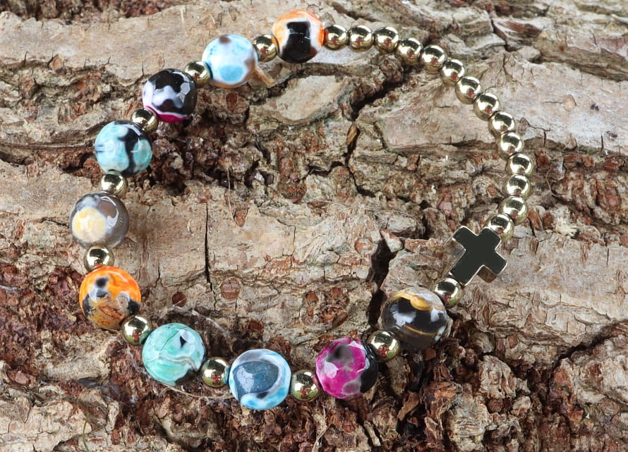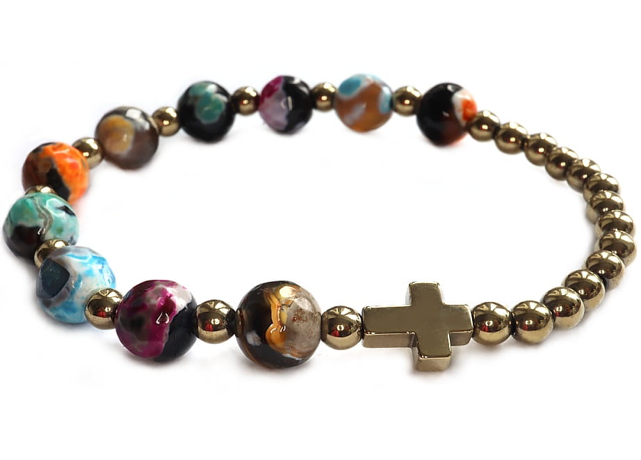Bransoletka różaniec z agatów antycznych kolorowych to wyjątkowy i stylowy dodatek, który łączy w sobie piękno naturalnych kamieni z duchowością różańca. Wykonana agatów o średnicy 8 mm w różnych kolorach, oraz kamieni hematytu w naturalnym, złotym kolorze. Kuleczki o wielkości 4mm.