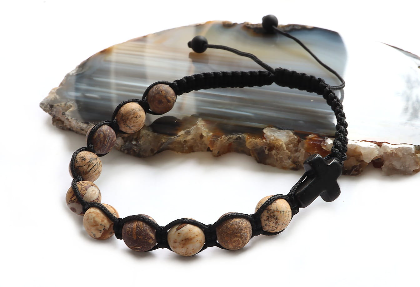 Różaniec wykonany jest z kamieni jaspis obrazkowy i jaspis kalahari. Wielkość kamieni 8 mm. Kamienie o trwałym kolorze, nie wycierają się, nie zmieniają koloru.