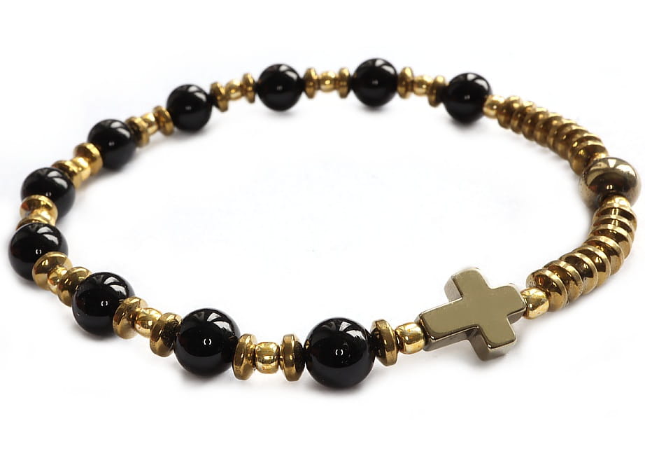 Różaniec - dziesiątka wykonany jest z z kamieni onyksu, złotego hematytu i złotych koralików toho.