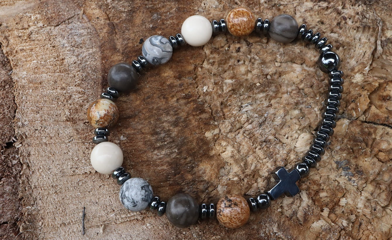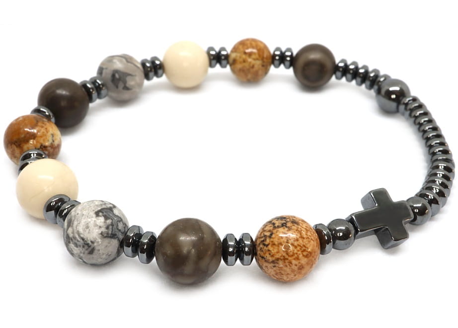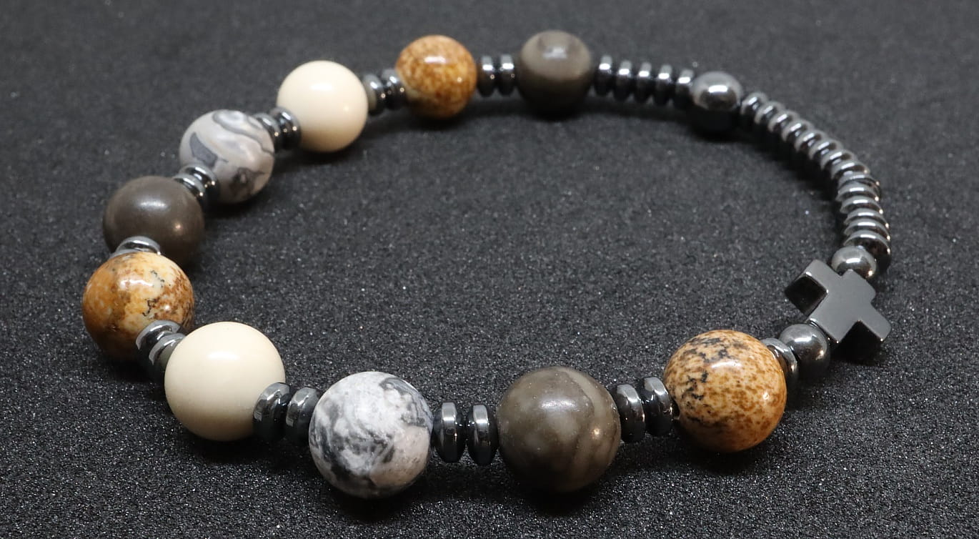 Połączenie naturalnych kamieni w kolorach ziemi i nowoczesnegy design sprawia, że ten różaniec jest wyjątkowy i niepowtarzalny. jaspisy obrazkowe, e piasso idealnie ze sobą się komponują. Antracytowy hematyt idealnie się z nimi komponuje. Różaniec na rękę to piękny symbol wiary i nadziei.