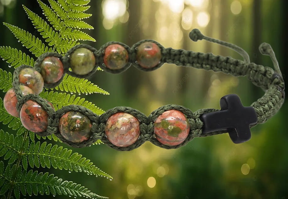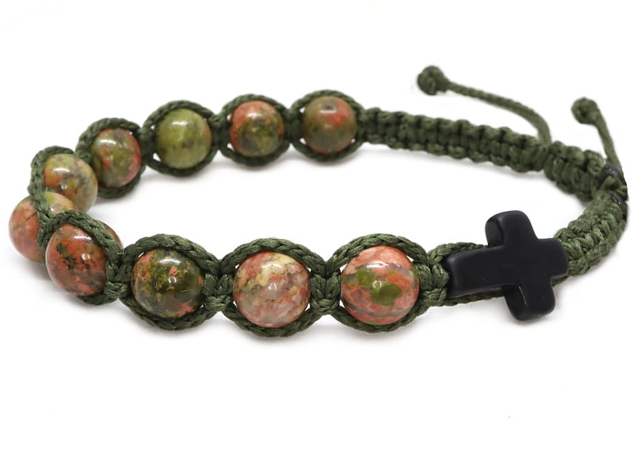 Odkryj wyjątkowe połączenie duchowości z surowym, naturalnym stylem. Ten ręcznie pleciony różaniec na nadgarstek to propozycja dla mężczyzn, którzy cenią przedmioty z duszą, wykonane z autentycznych materiałów. Połączenie głębokiej, oliwkowej zieleni sznurka z ziemistymi odcieniami unakitu tworzy całość, która pasuje zarówno do codziennego ubioru, jak i wypraw w nieznane.