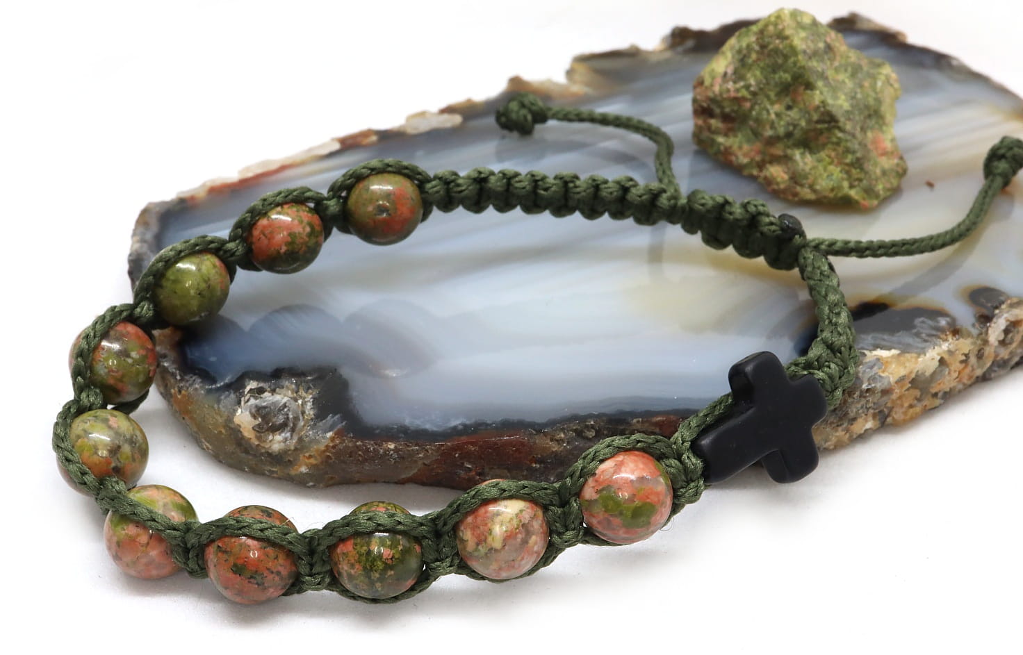 Kamień: Naturalny unakit (matowy/półmatowy), czarny howlit (krzyż).