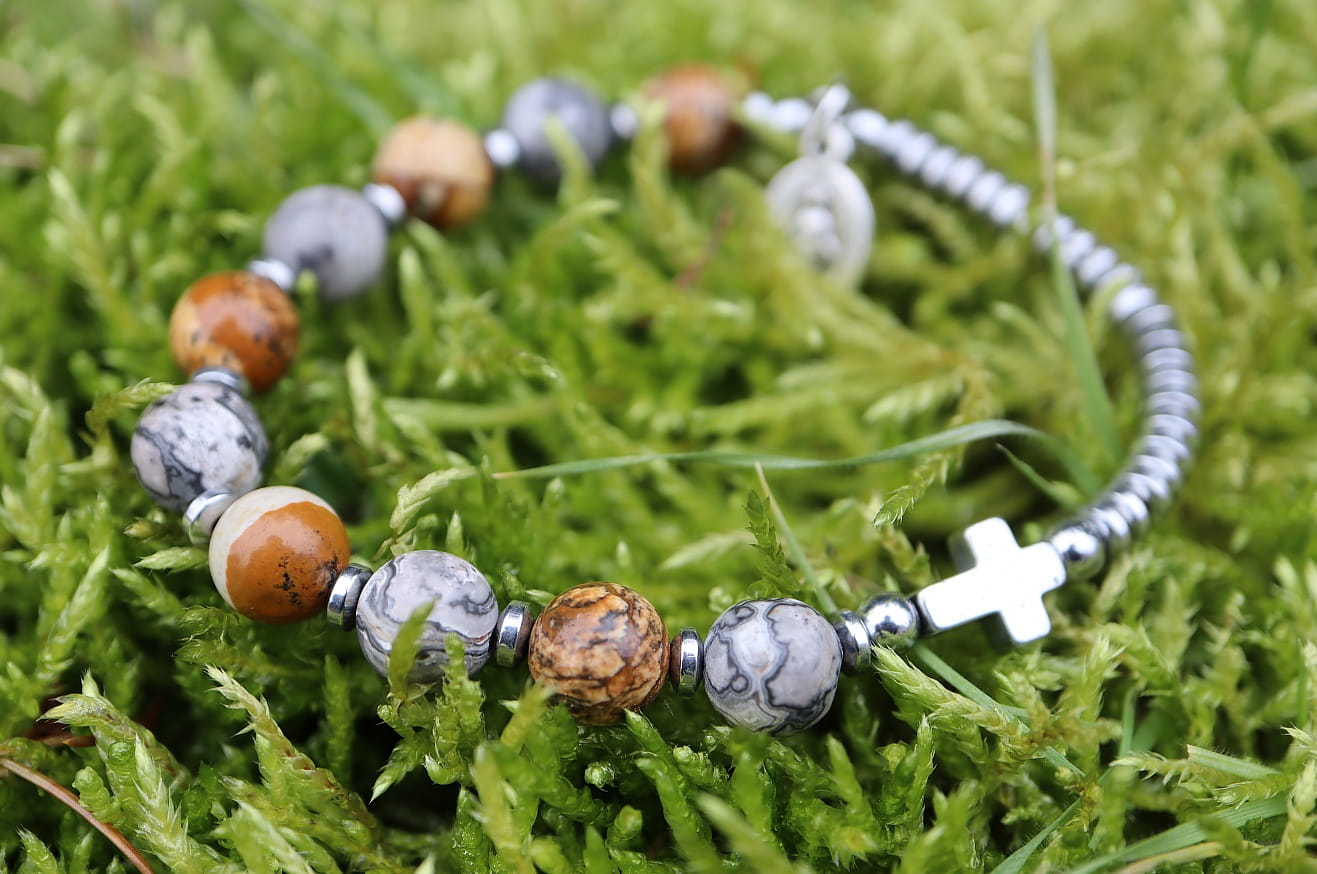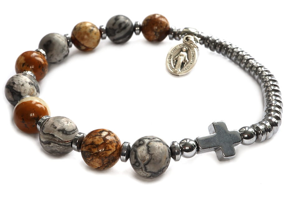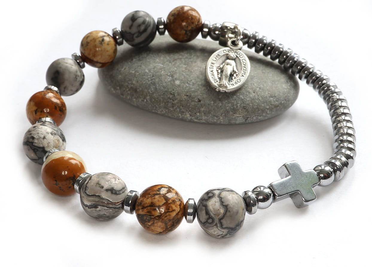 Różaniec wykonany z kamieni JASPIS OBRAZKOWY i JASPIS PICASSO, oraz z hematytu srebrnego. Kamienie mają wielkość 8mm, krążki 4mm, krzyżyk 10mm.