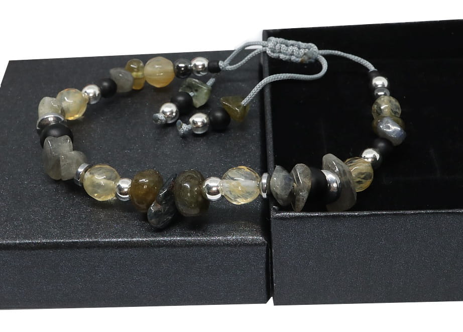 Delikatna, kobieca bransoletka sznurkowa z kamieni labradoryt, cytryn, hematyt. Rozmiar uniwersalny, opakowana w eleganckie pudełko prezentowe.