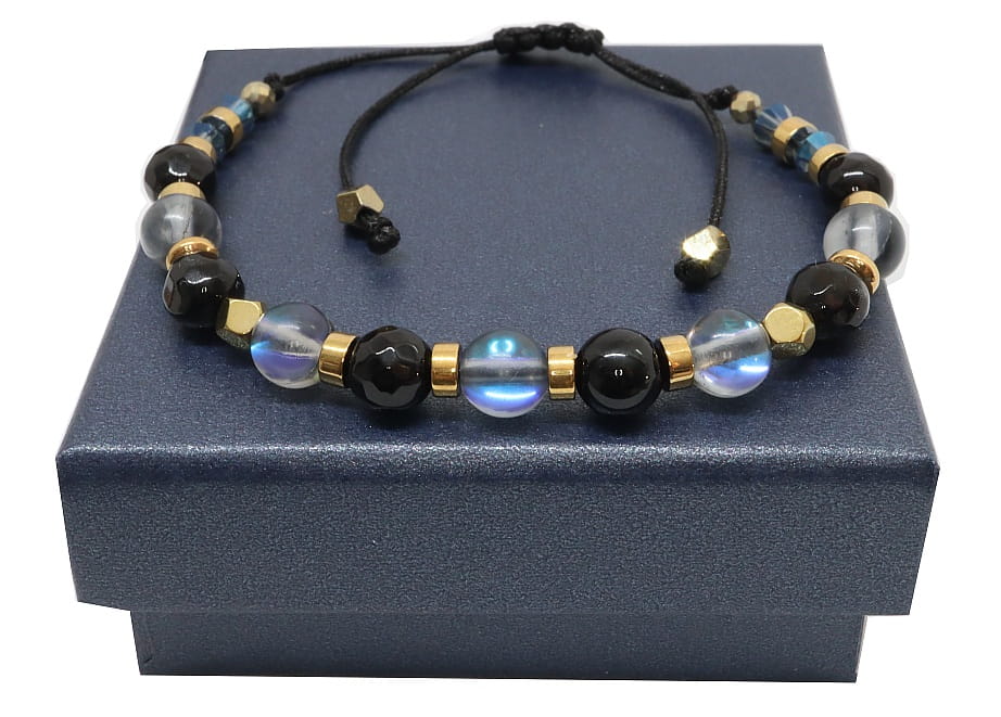 Bransoletka z delikatnego sznurka, oraz kamieni czarny turmalin, złoty hematyt, cyrkonie opalizujące na niebiesko, koraliki bicone. Opakowana w eleganckie pudełeczko.