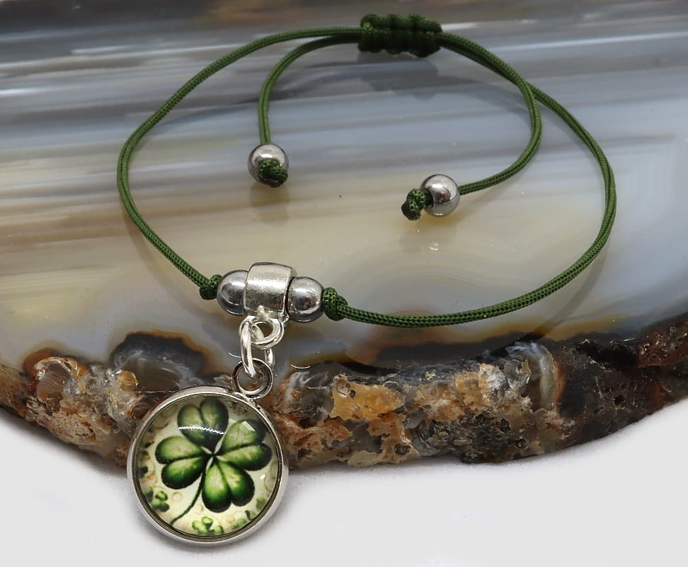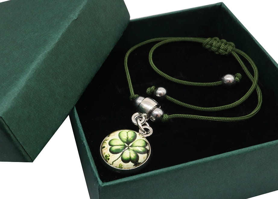 Materiał: Wysokiej jakości sznurek jubilerski 1 mm, kaboszon z motywem koniczynki.