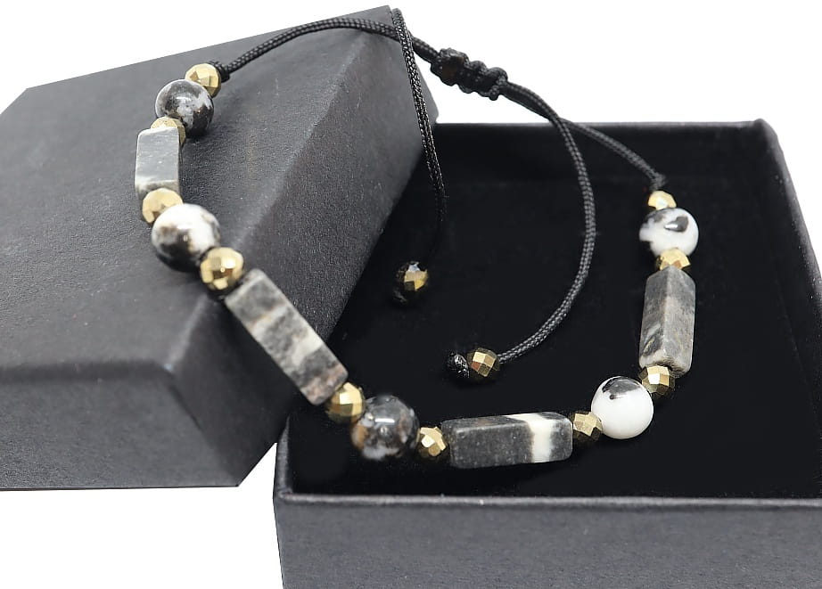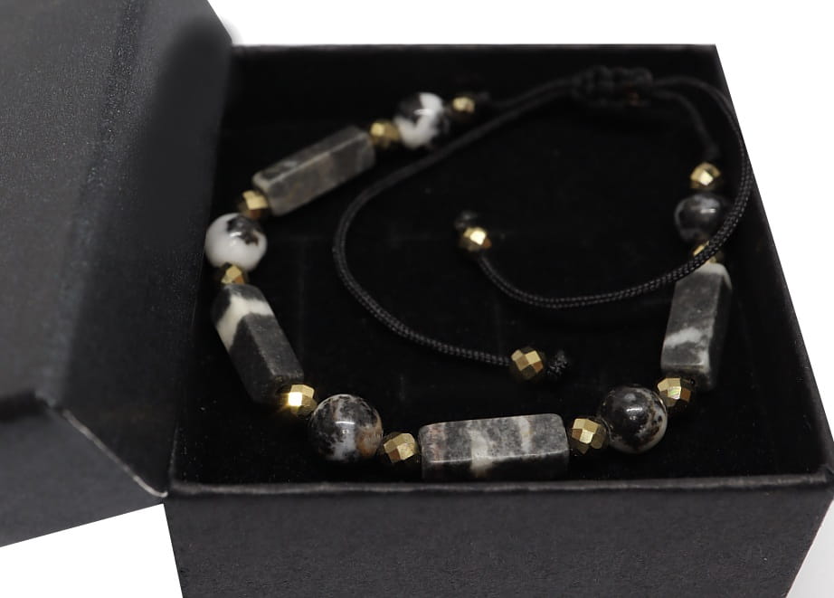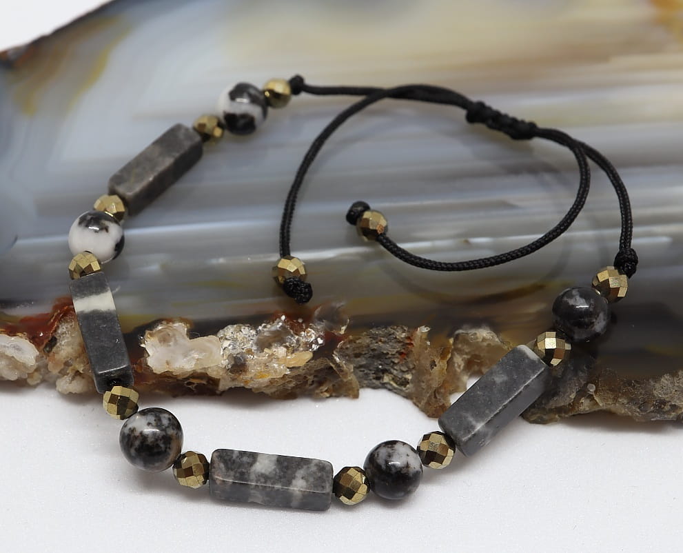 Wykonana z delikatnego, ale bardzo mocnego i trwałego sznureczka na którym umieszczone zostały następujące kamienie marmuru i złotego hematytu.