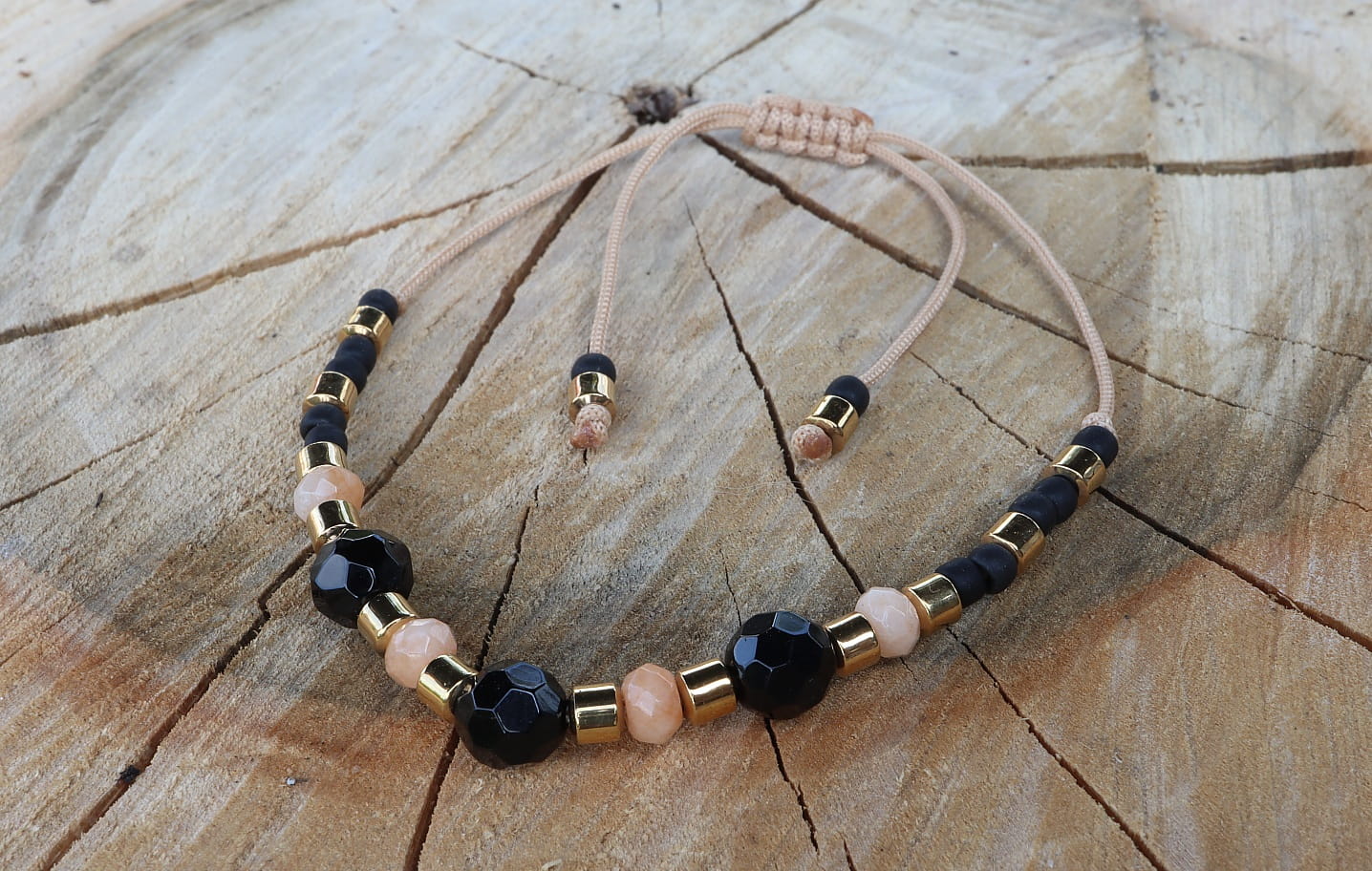 Delikatna, kobieca bransoletka z drobnymi kamieniami - fasetowanym onyksem 6mm, kamieniami beżowego jadeitu rondelle 4mm, kamieniami złotego hematytu i drobnych czarnych toho..