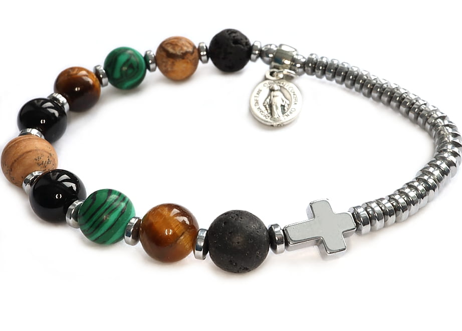 Różaniec wykonany z kamieni onyksu, tygrysiego oka, lawy wulkanicznej, jaspisu obrazkowego i hematytu srebrnego. Kamienie mają wielkość 8mm, krążki 4mm, krzyżyk 10mm.