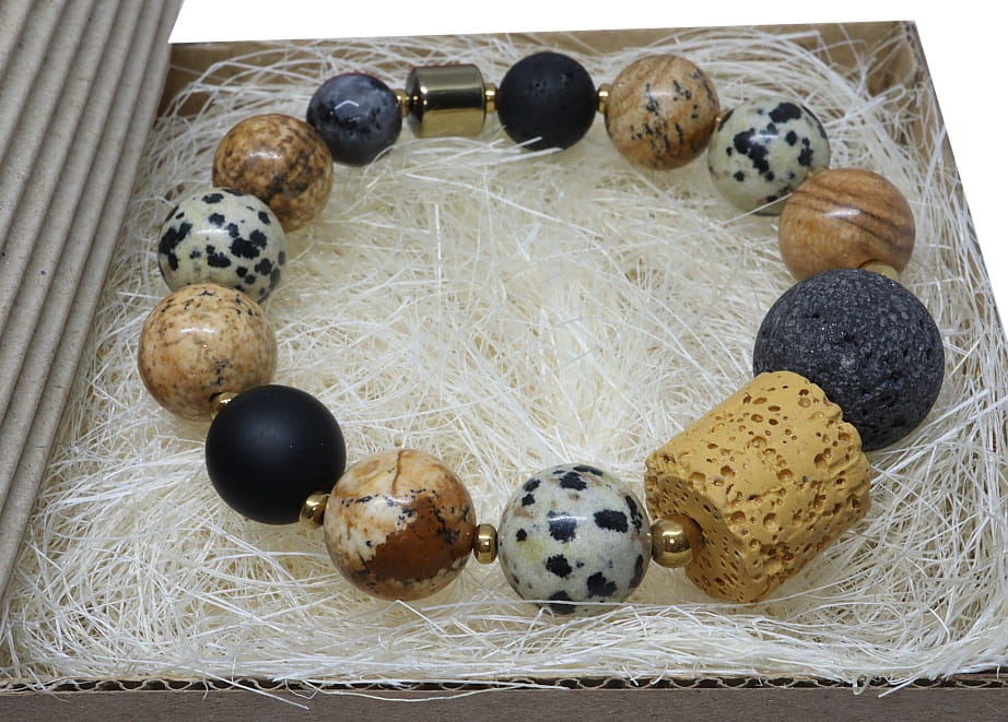 Oryginalna bransoletka damska, wykonana z miksu kamieni - lawy wulkanicznej, jaspisu, labradorytu, hematytu złotego. Wielkość kamieni 1,2cm. Baza - mocna, silikonowa gumka. Rozmiar ok 19cm.