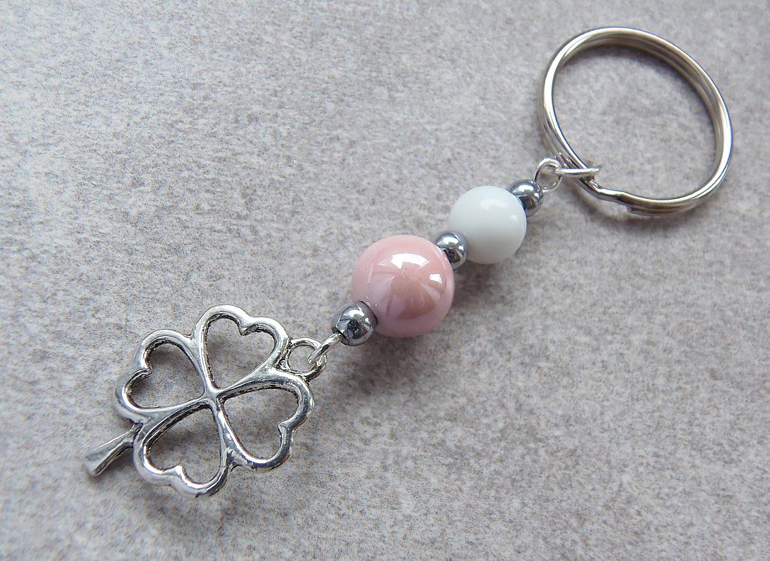 Uroczy, delikatny breloczek do kluczy, którego ozdobą jest koniczynka przynosząca szczęście.