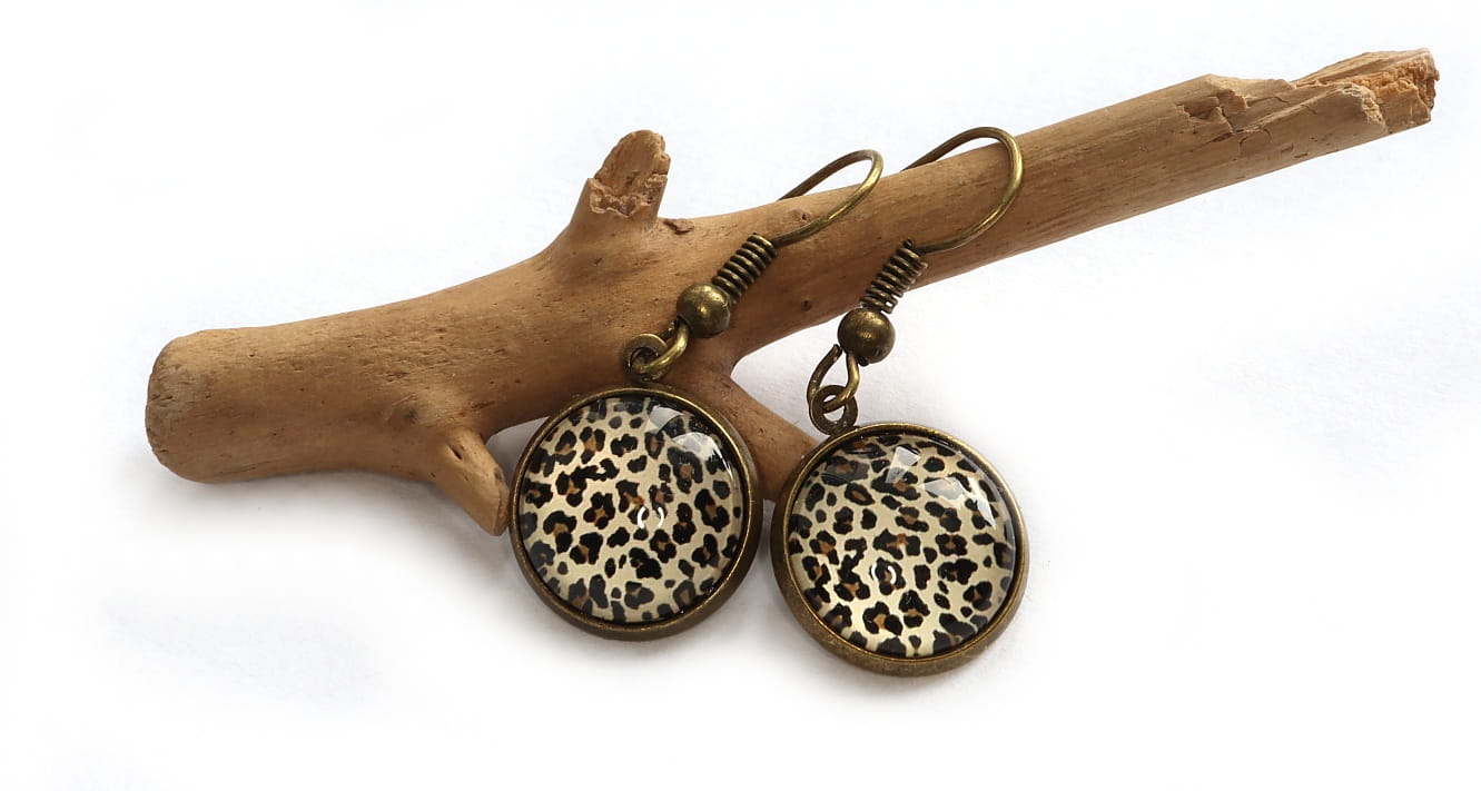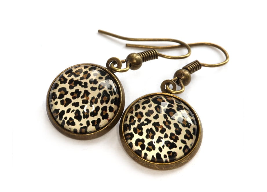 Urocze, delikatne kolczyki w kolorze antycznego złota ze szklanym kaboszonem - panterką.