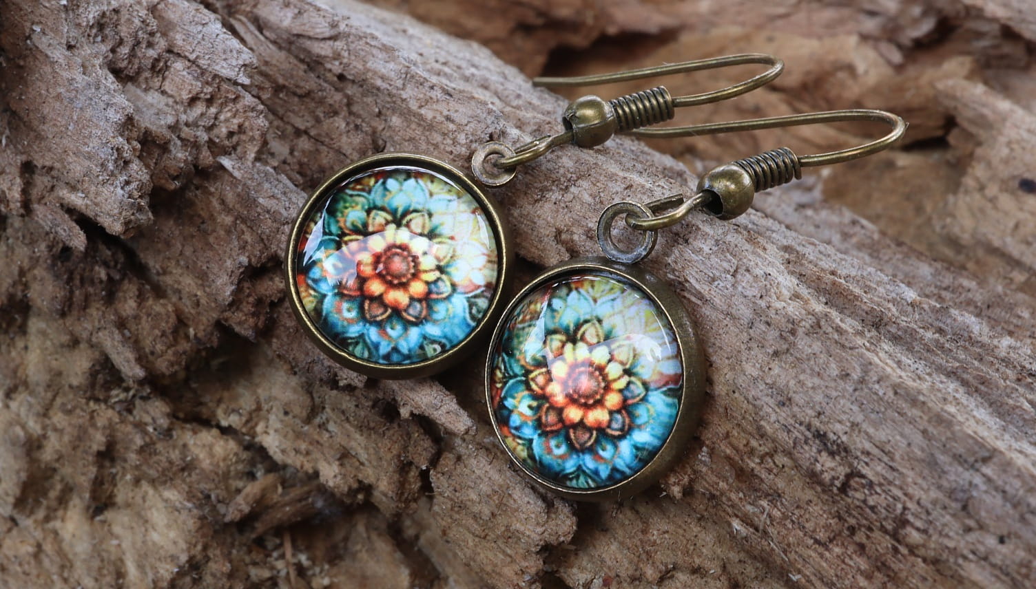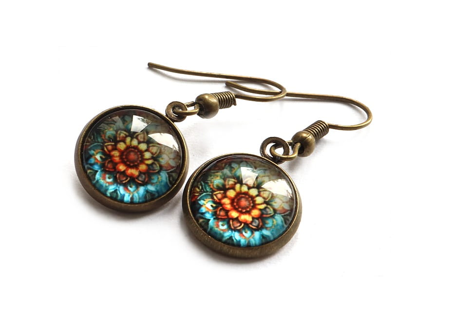 Szukasz wyjątkowej biżuterii, która połączy w sobie klasę i nutkę egzotyki? Kolczyki z antycznego złota ze szklanym kaboszonem ze wzorem Mandala to idealny wybór dla Ciebie!