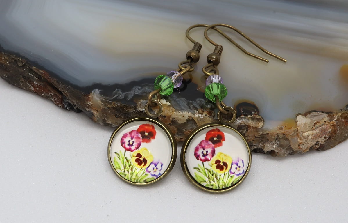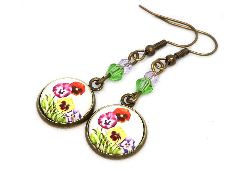 - W centralnej części kolczyków znajdują się szklane kaboszony ozdobione kwiatami bratków. Wielkość kaboszonu 12mm.