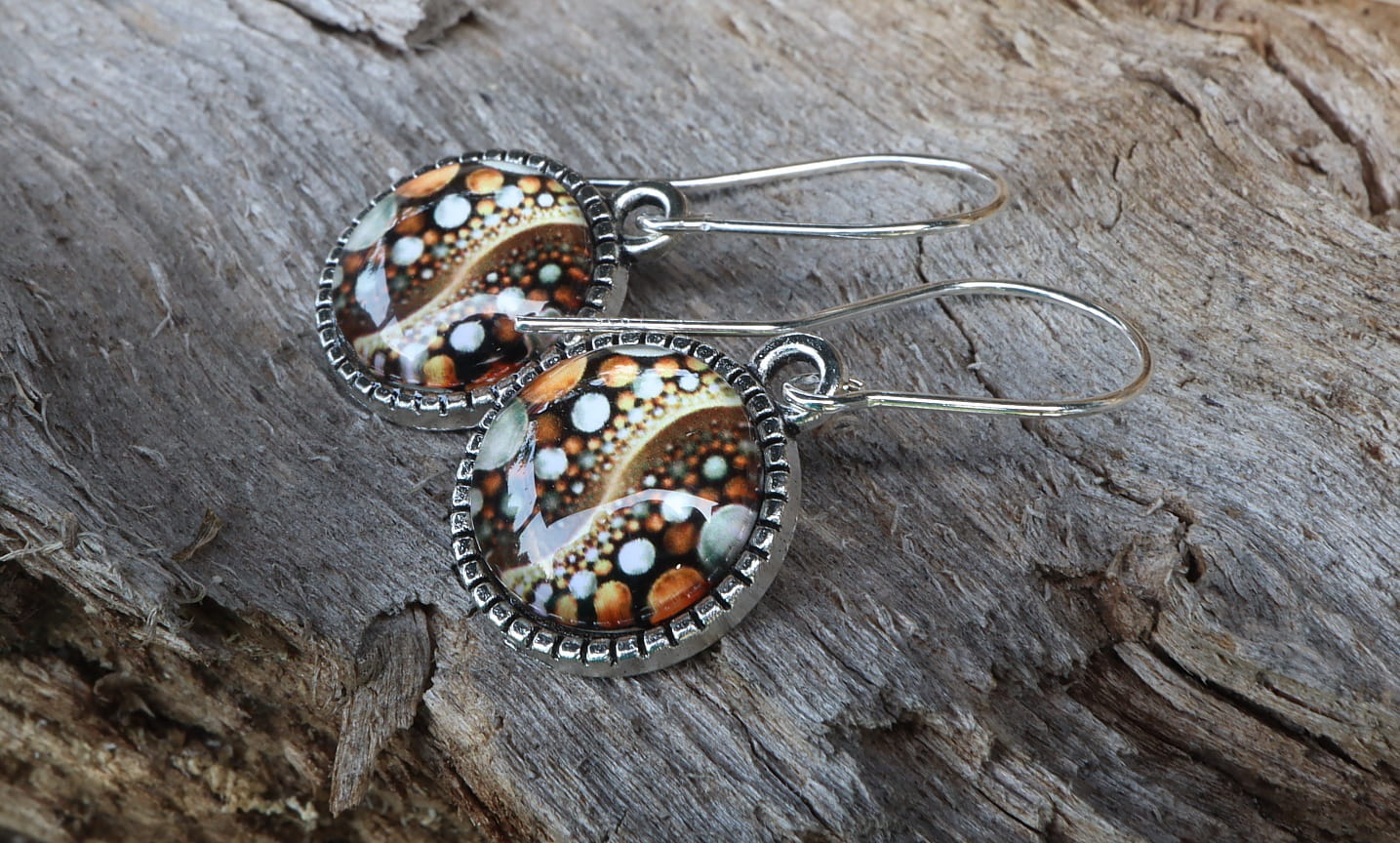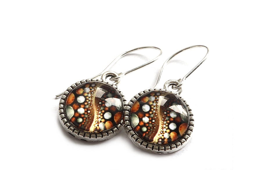 Ciekawe kolczyki ze szklanym kaboszonem w tonacji brązowej.