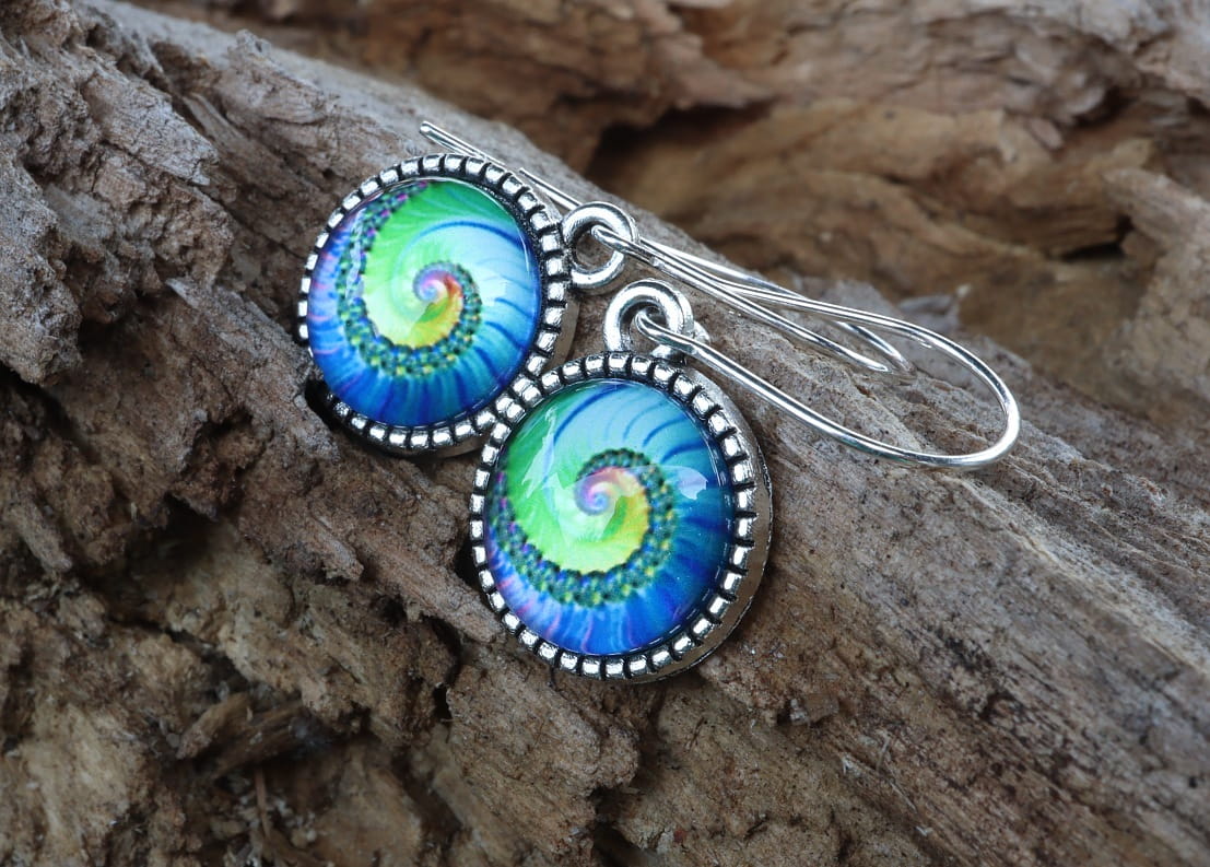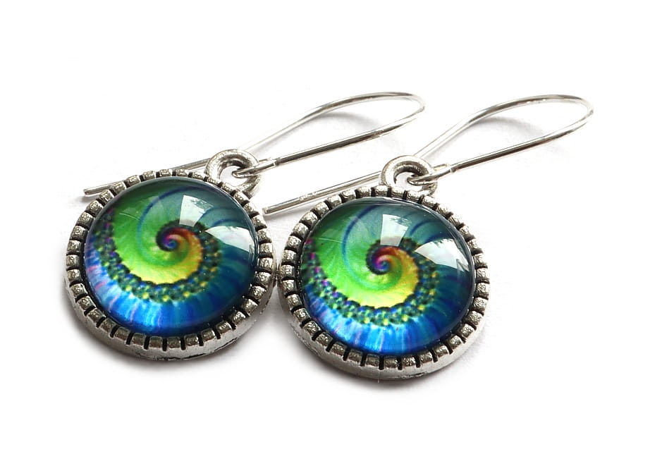 Ciekawe, delikatne kolczyki ze szklanym kaboszonem w tonacji turkusowo zielonej.
