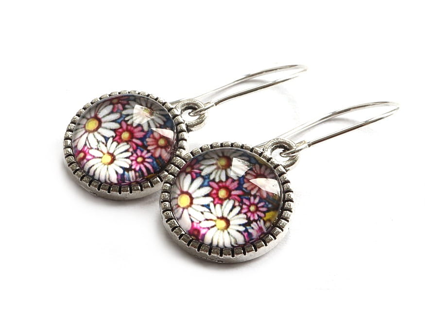 Urocze, delikatne kolczyki ze szklanym kaboszonem z kwiatami.