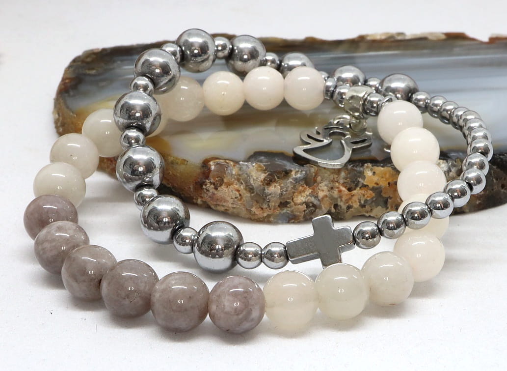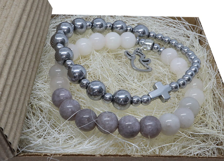 Różaniec ze srebrnego hematytu: Klasyczny i elegancki, wykonany z hematytu w dwóch rozmiarach (8 i 4 mm). Chłodny blask srebra nadaje mu nowoczesnego, a zarazem godnego charakteru.
