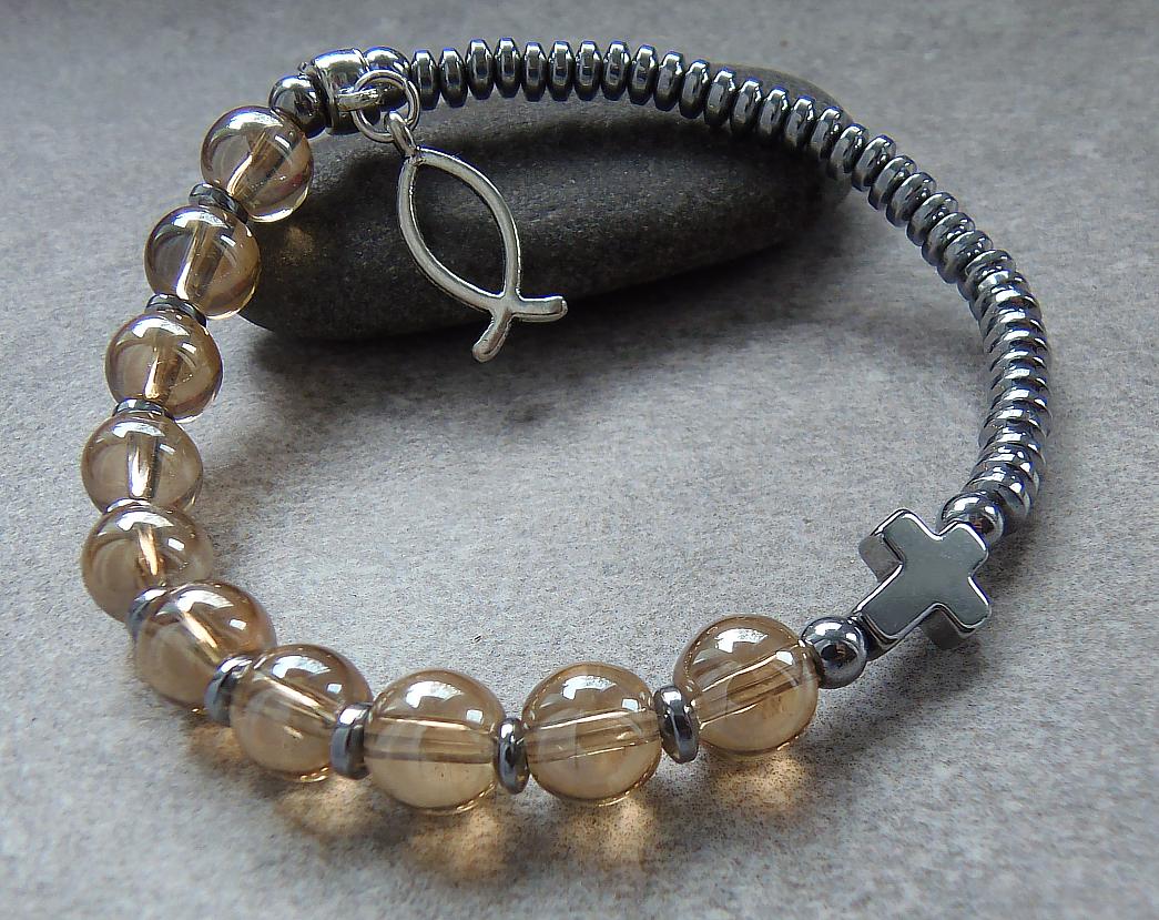 Bardzo wygodna w noszeniu, zakładaniu - bazą jest gumka silikonowa /mocna, odporna na przecieranie/. Wykonana jest z kamieni kwarcu opalizującego piaskowego 8mm, oraz hematytu.