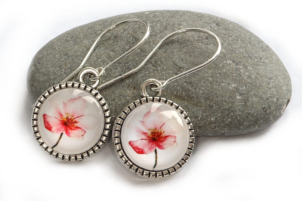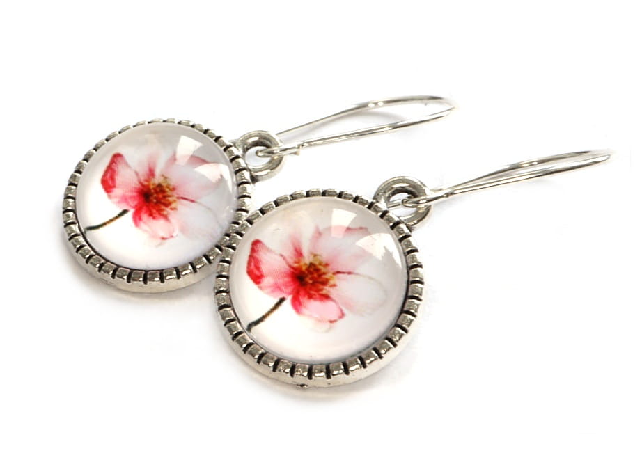Romantyczne, delikatne kolczyki ze szklanym, kwiatowym kaboszonem.
