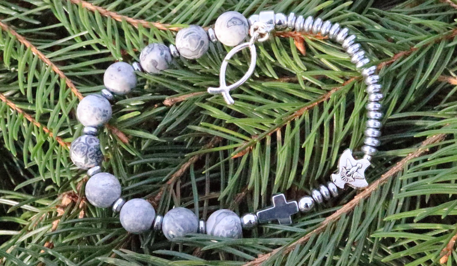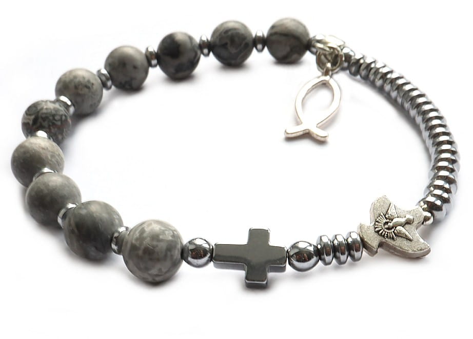 Różaniec wykonany z jaspisów szarych o wielkości 8mm, oraz hematytu srebrnego. Krążki 4mm, krzyżyk 10mm. Do różańca przyczepiona jest rybka - znak chrześcijaństwa, oraz Duch Św.
