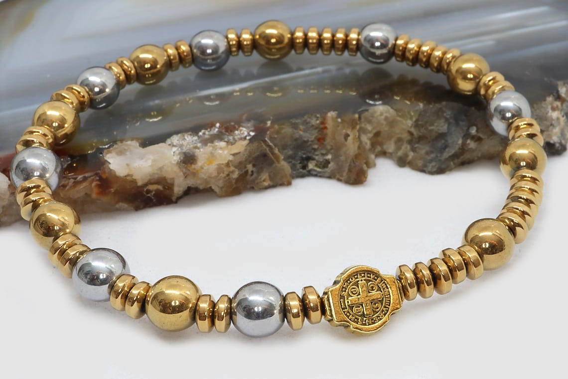 Wyjątkowy różaniec w formie bransoletki, wykonany z wysokiej jakości hematytu w dwóch kontrastujących odcieniach: klasycznego srebra oraz lśniącego złota. To nie tylko biżuteria o nowoczesnym charakterze, ale przede wszystkim osobiste narzędzie modlitewne, które możesz mieć zawsze przy sobie.