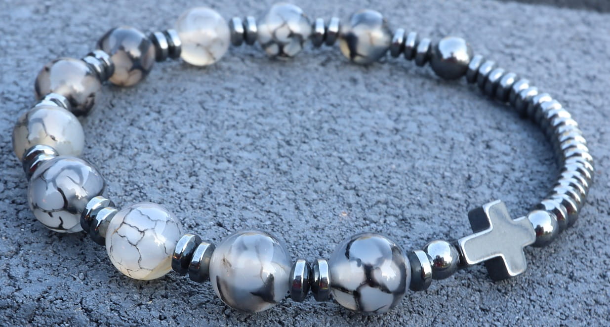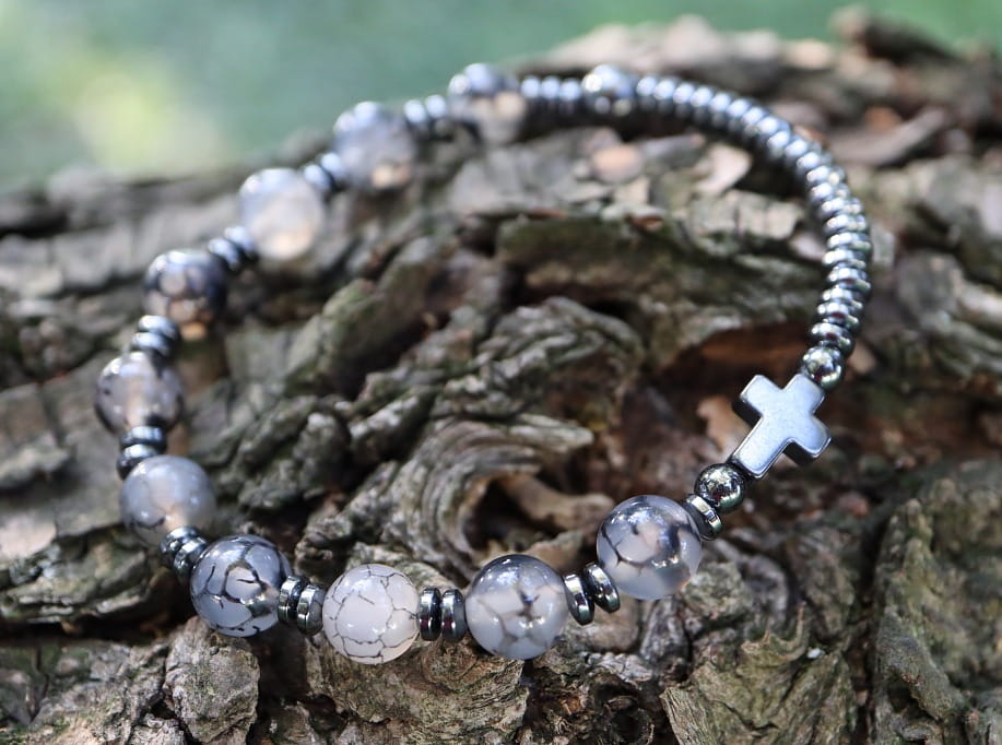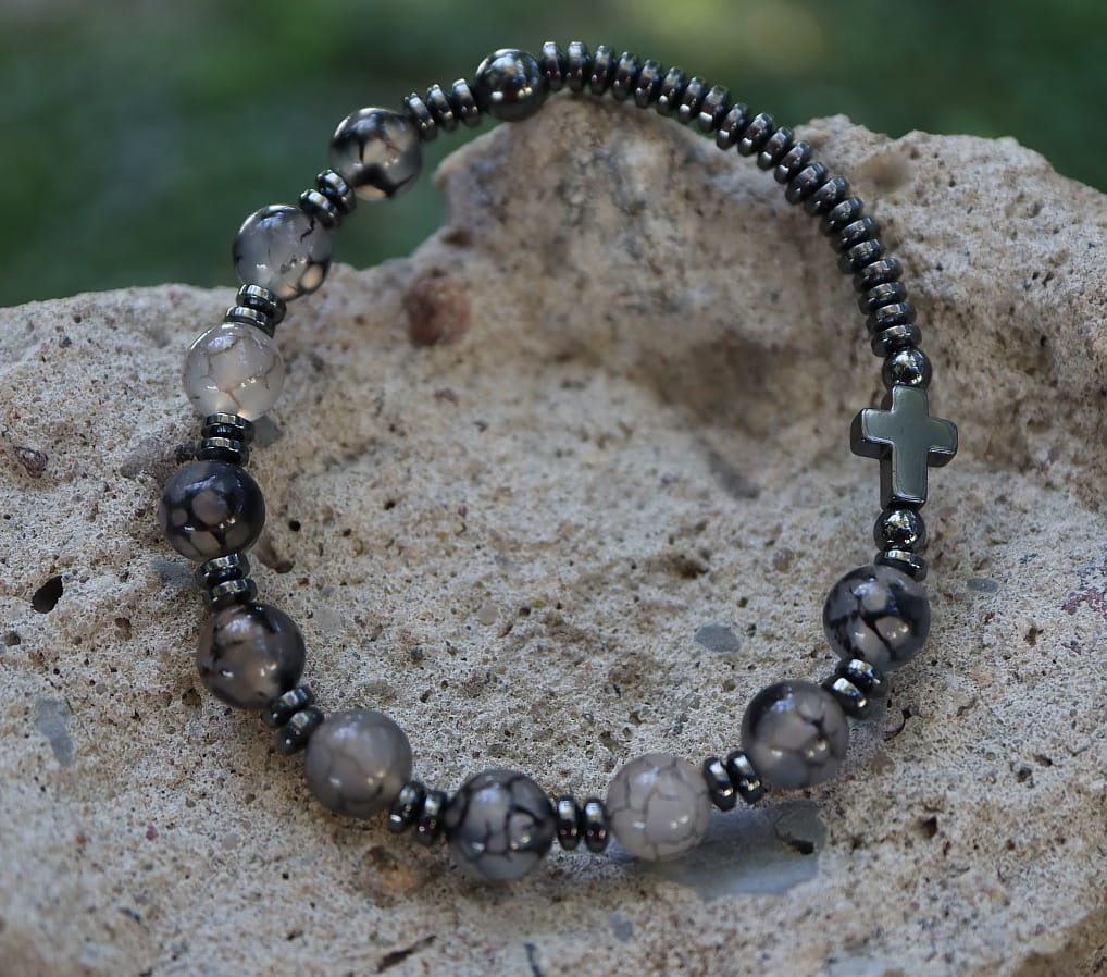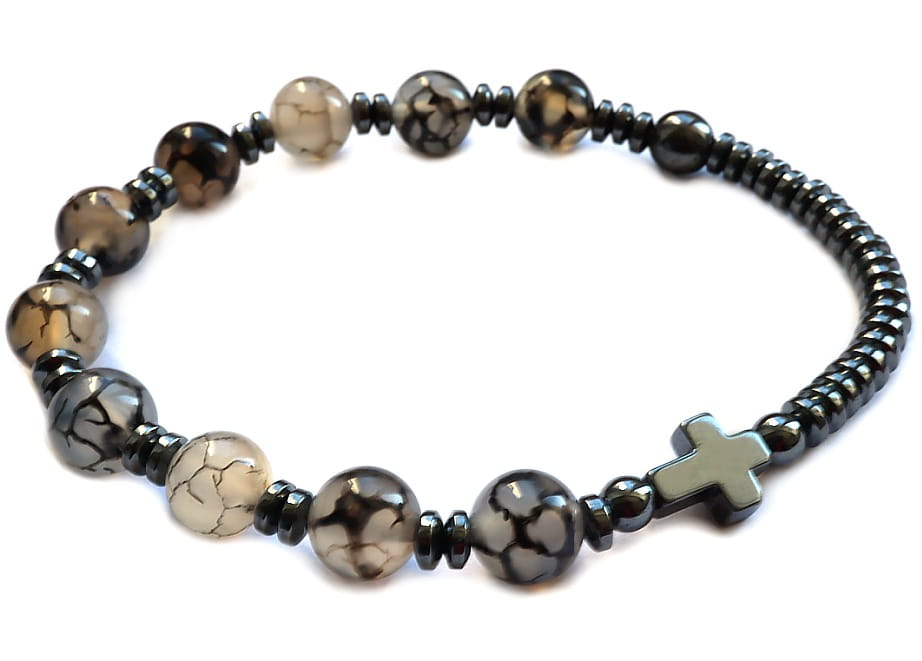 Różaniec wykonany z agatów smoczych szarych o wielkości 8mm, oraz hematytu w kolorze antracytowym. Krążki 4mm, krzyżyk 10mm.