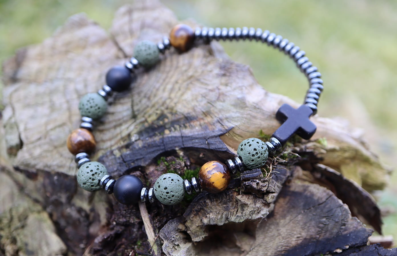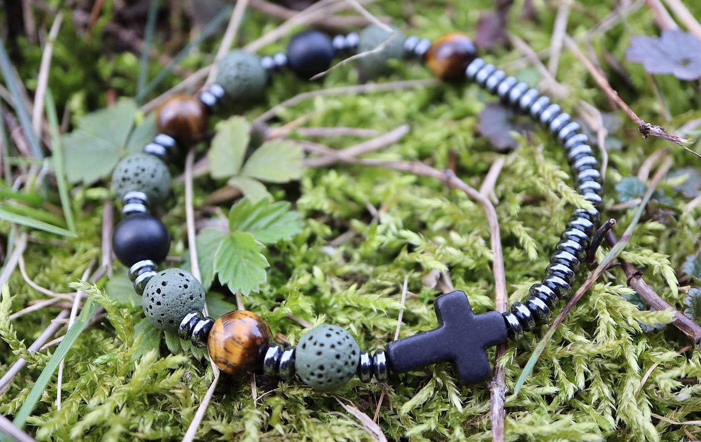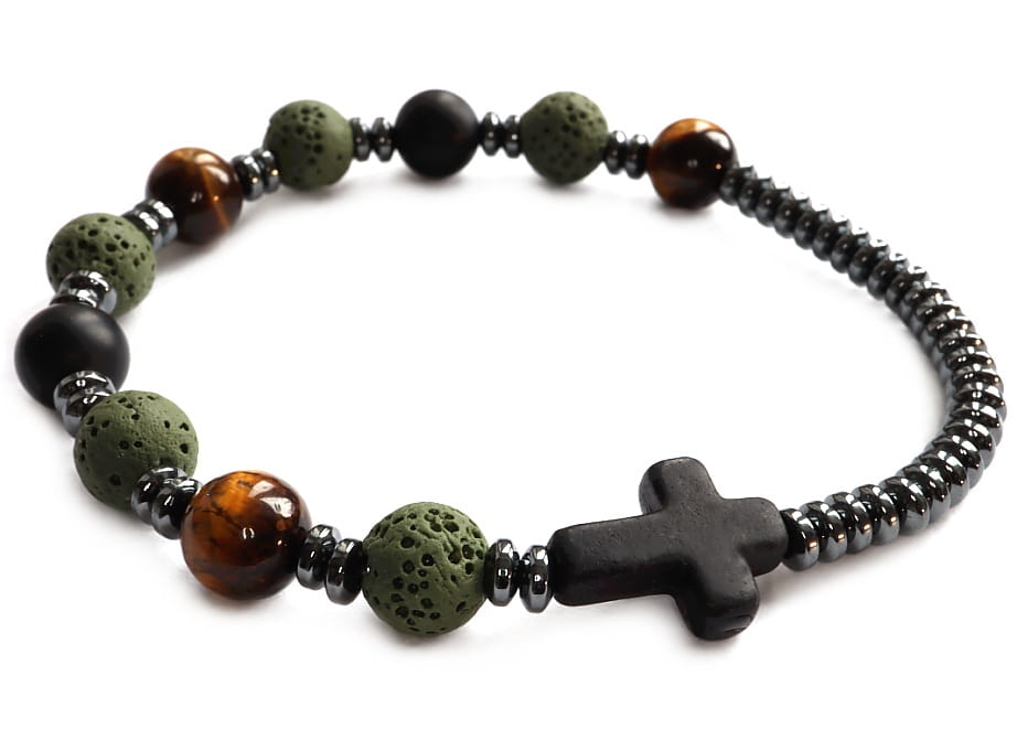Połączenie naturalnych kamieni w kolorach ziemi i nowoczesnegy design sprawia, że ten różaniec jest wyjątkowy i niepowtarzalny. Tygrysie oko, zielona lawa wulkaniczna i kamienie tygrysiego oka idealnie ze sobą się komponują. Czarny krzyż z howlitu to symbol wiary i nadziei.