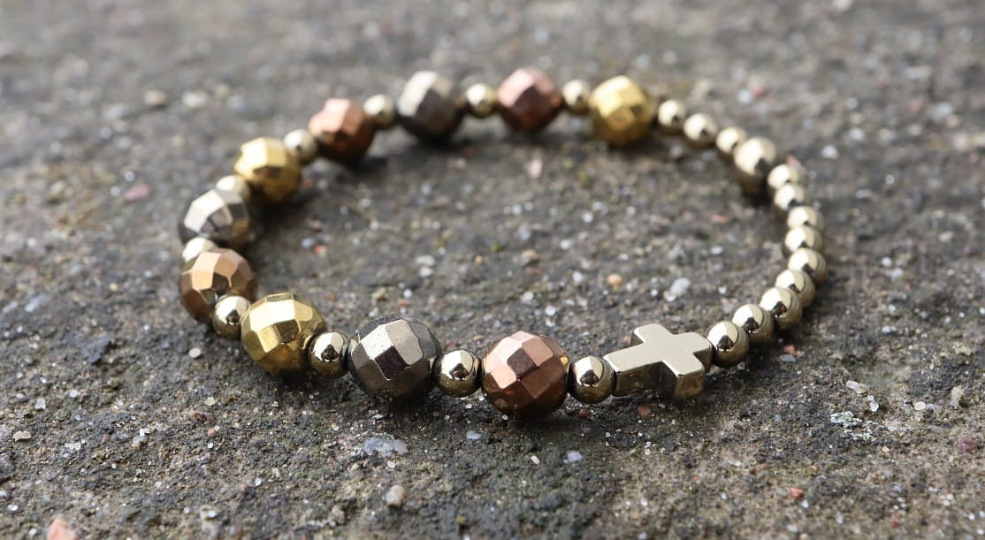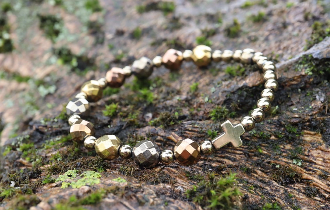 Różaniec w całości wykonany jest z kamieni hematytu w kilku odcieniach złota.