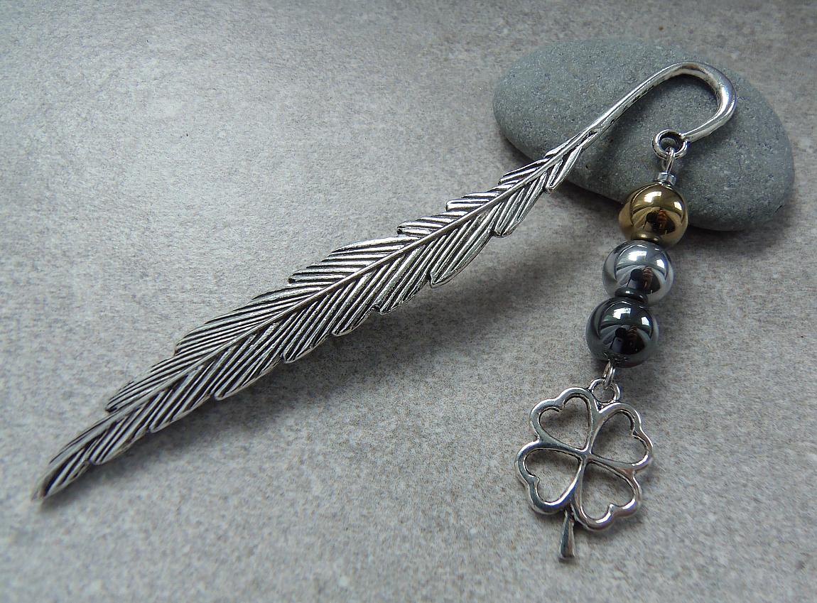 Oryginalna zakładka do książki, której ozdobą jest KONICZYNKA przynosząca szczęście, oraz kamienie hematyt w kolorze stalowym, srebrnym i złotym.