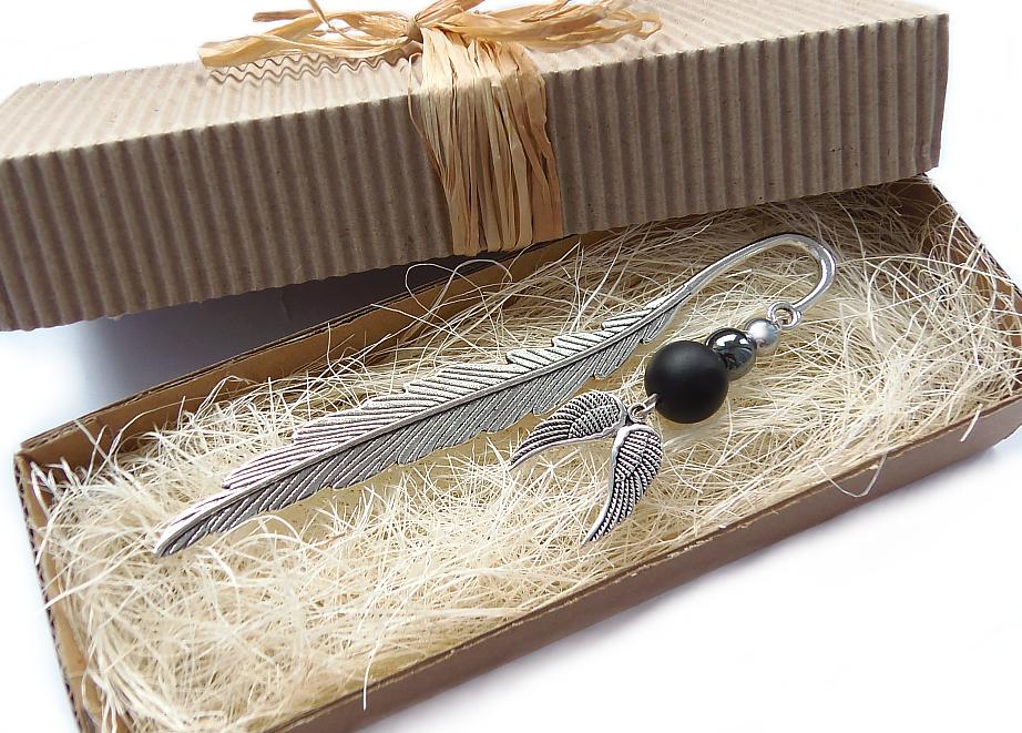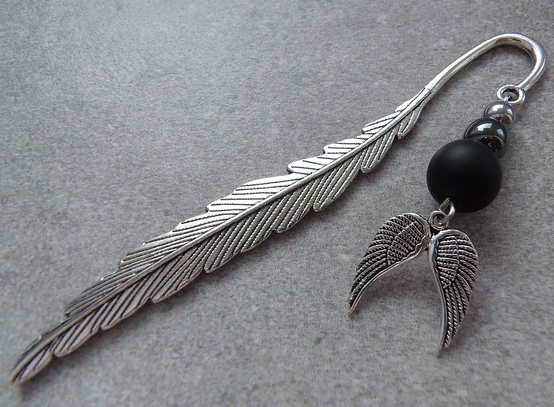 Oryginalna zakładka do książki, której ozdobą są skrzydła anioła z kamieniami onyksu matowego /1,2cm, oraz hematytem stalowym i srebrnym.