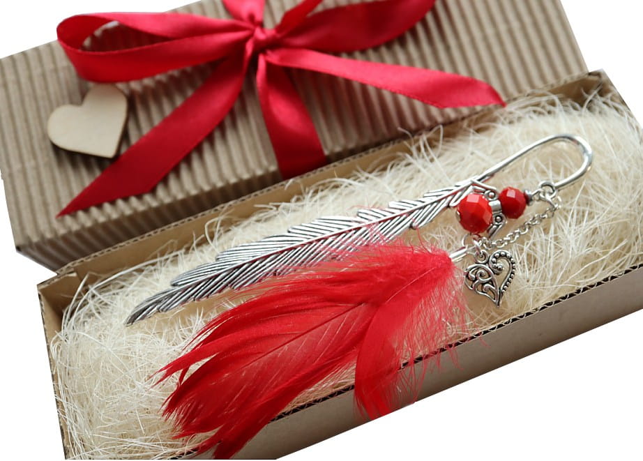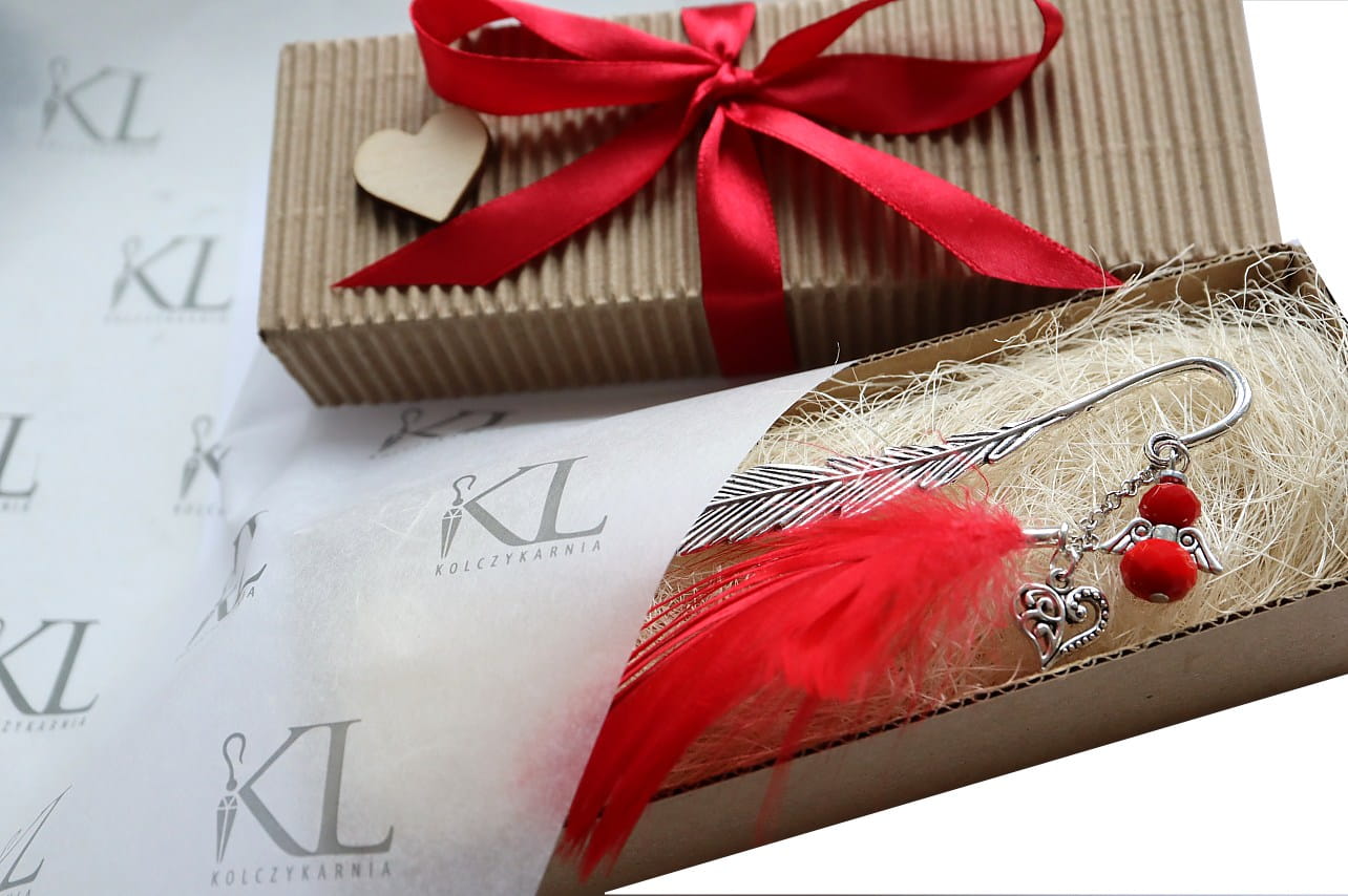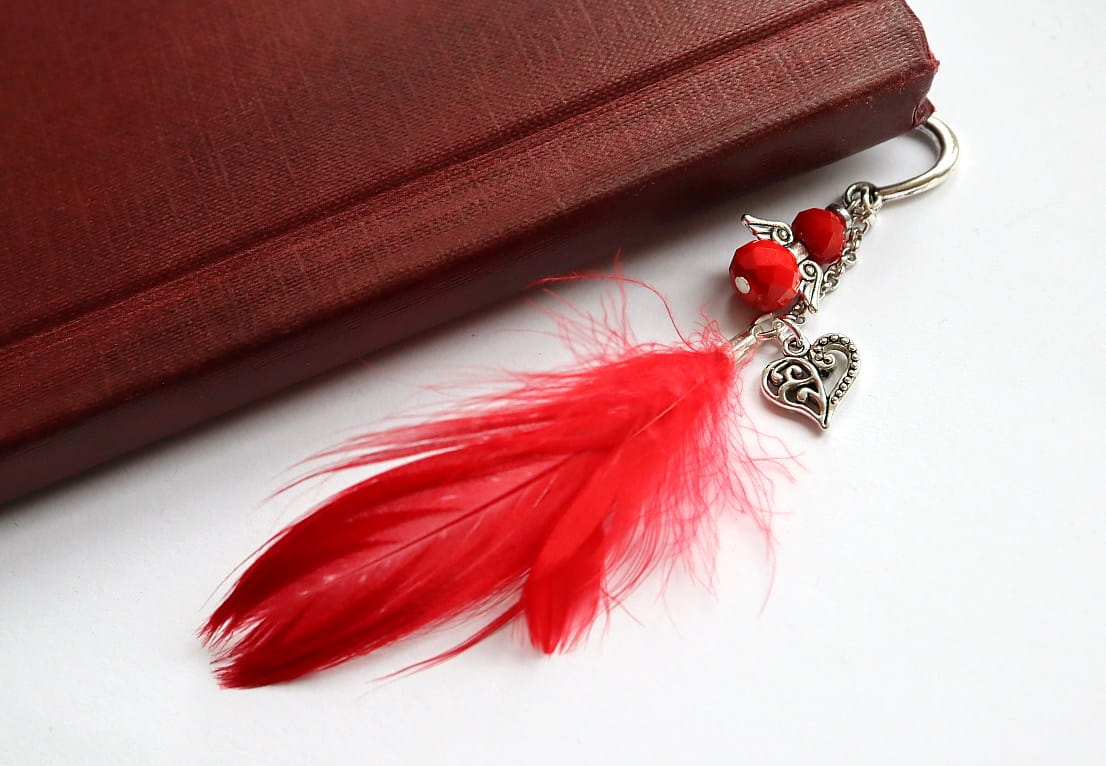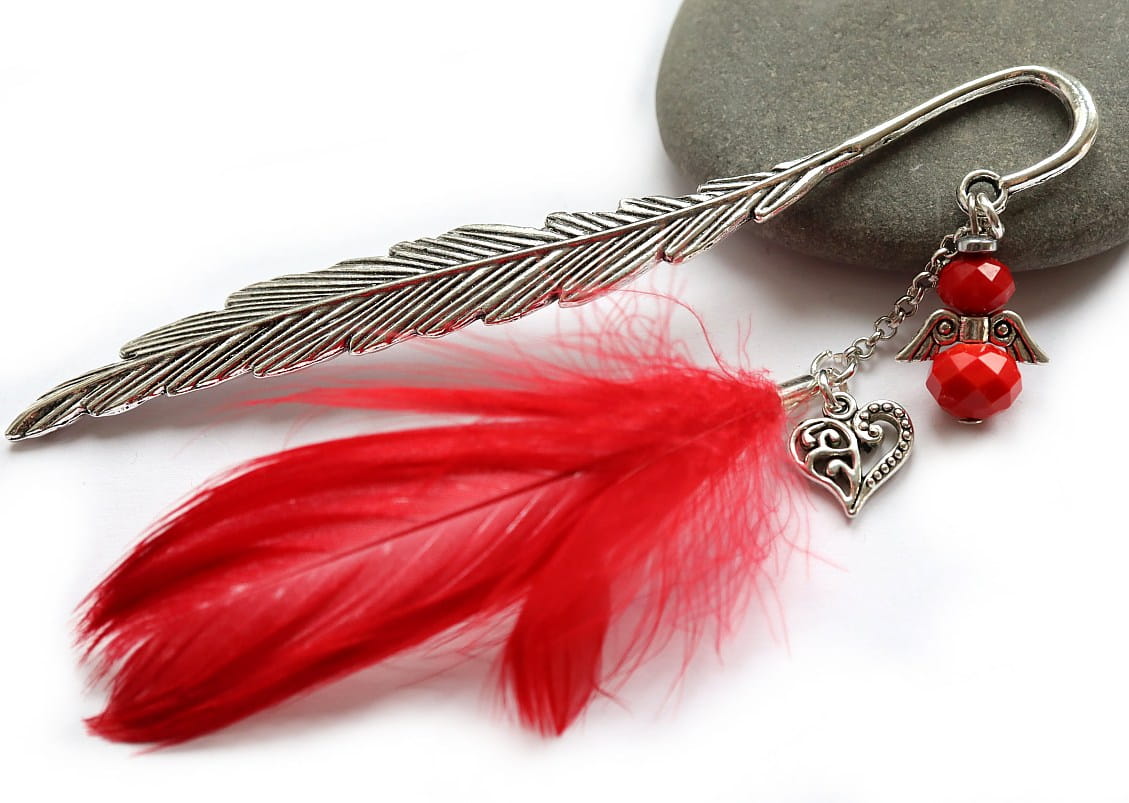 Zakładka do książki z aniołem, puszystym, czerwonym piórkiem i filigranowym sercem - idealny pomysł na ciekawy prezent.