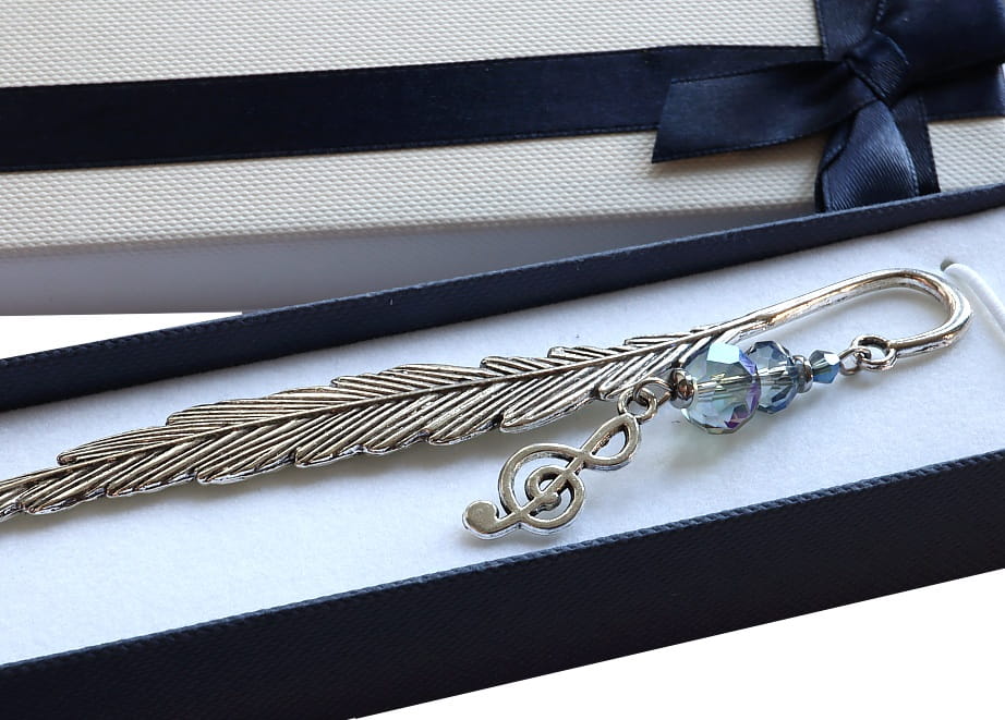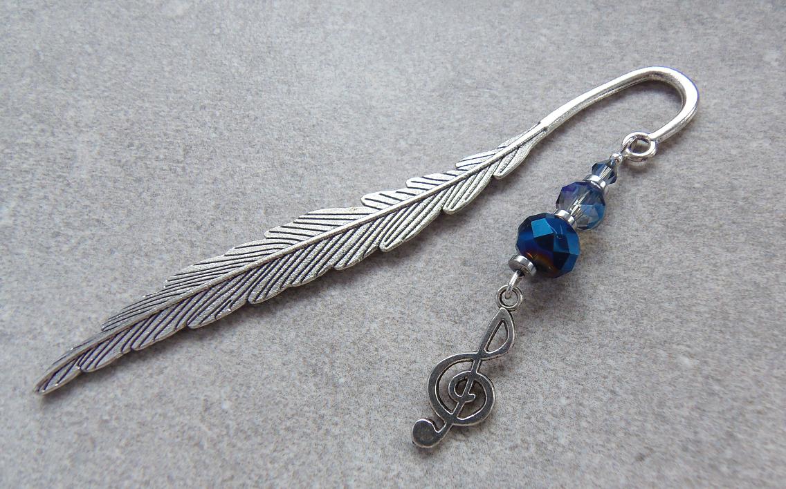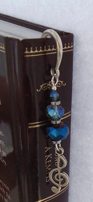 Ozdobą zakładki jest klucz wiolinowy z kryształkami rondelle i bicone w tonacji granatowo niebieskiej.