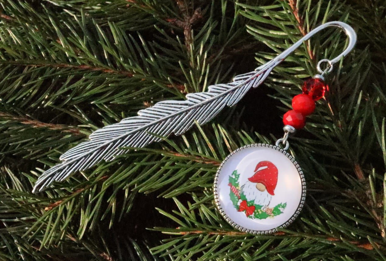 Urocza, świąteczna zakładka do książki, wykonana z najwyższej jakości materiałów: szklanego kaboszonu z Mikołajem, oraz kryształków rondelle w trzech odcieniach czerwieni.