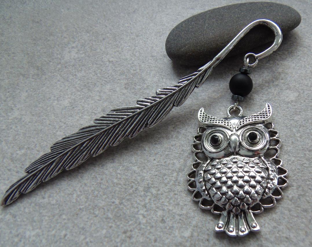 Zakładka ma kształt pióra, którego ozdobą jest piękna sowa - symbol wiedzy, mądrości, oraz kamień onyksu matowego, oraz plasterki hematytu.