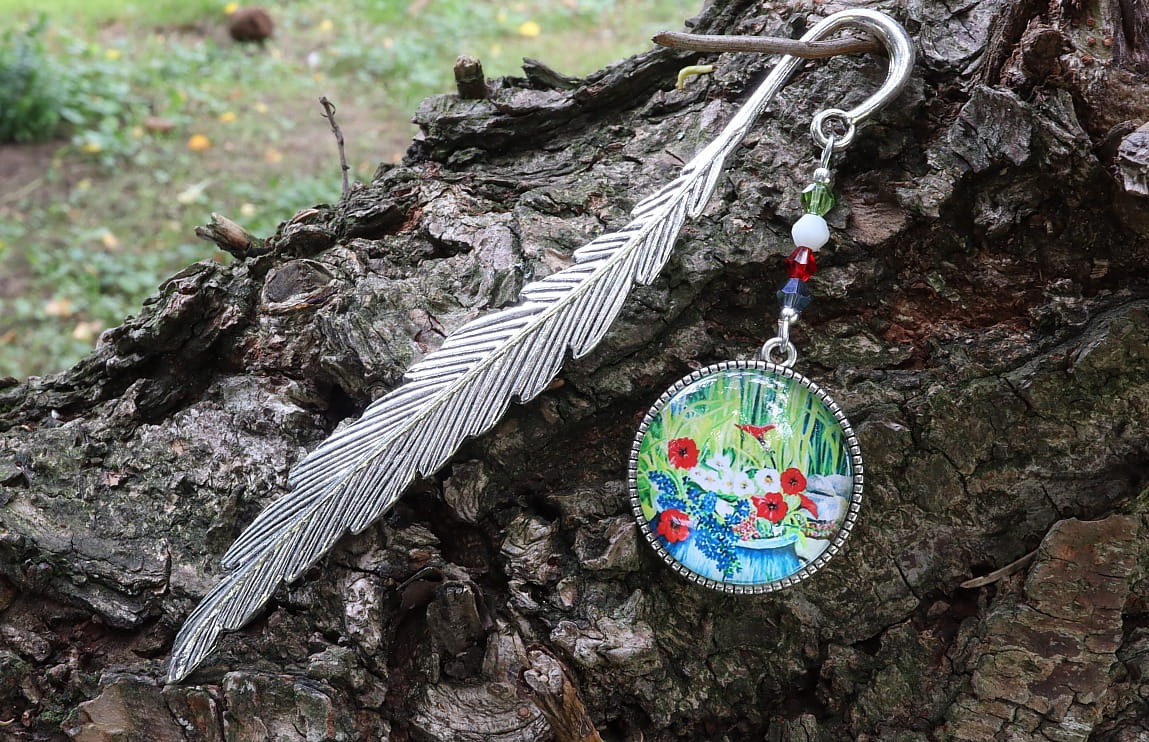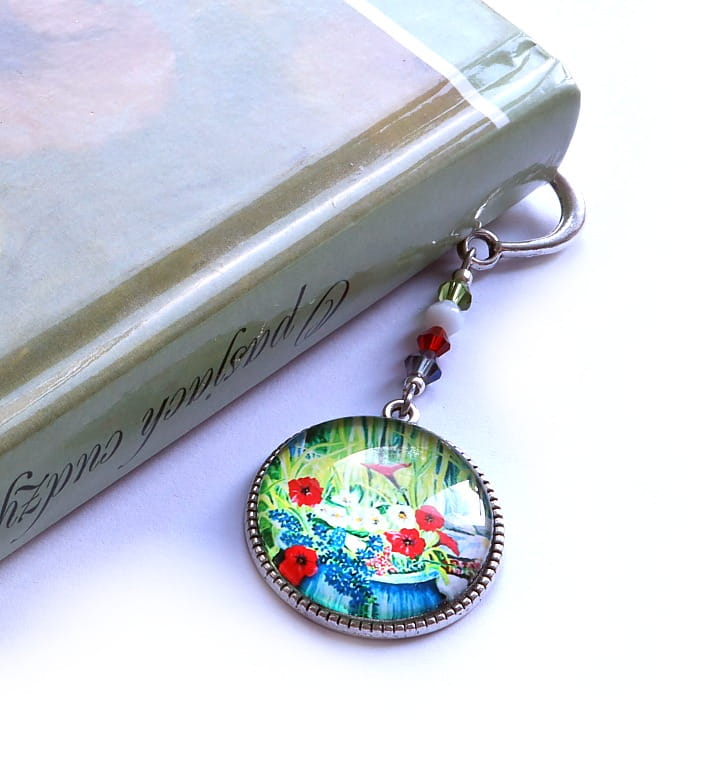Zakładka do książki, kalendarza, notesu z pięknym, szklanym, kwiatowym kaboszonem, przedstawiającym polne kwiaty.