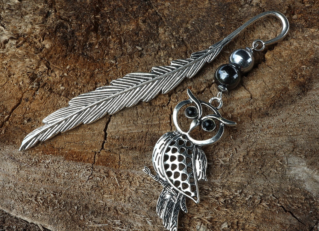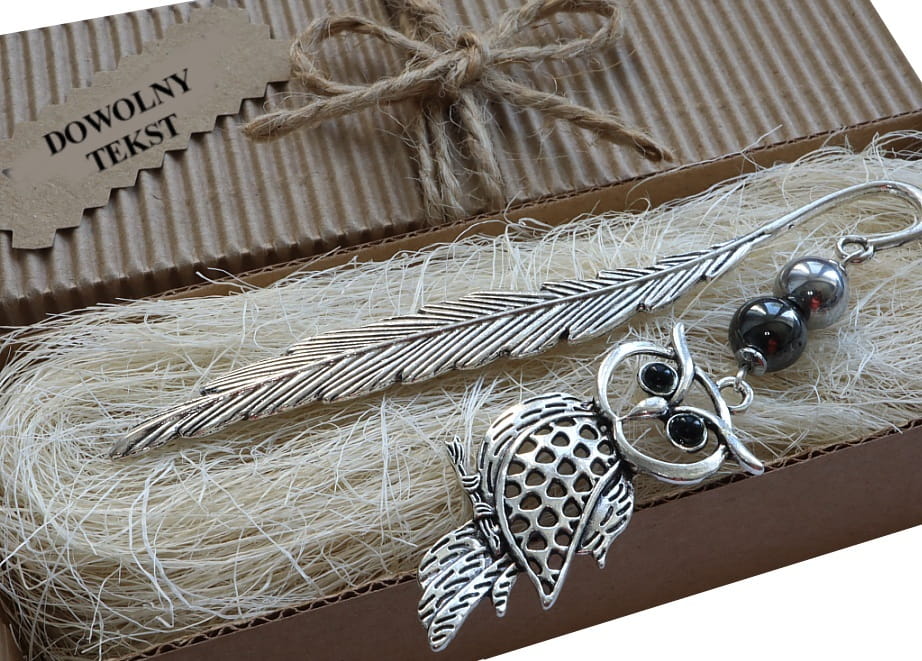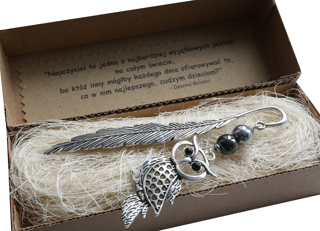 Zakładka wykonana z wysokiej jakości metalu, którego ozdobą jest sowa, oraz kamienie hematytu antracytowego i srebrnego. Hematyt to kamień symbolizujący siłę, odwagę i koncentrację – idealny dla osób, które pragną osiągnąć swoje cele. Całość opakowana w eleganckie, ręcznie wykonane eko pudełko na którym zamieszczona jest dedykacja dla nauczyciela - rok 2026. Jest to gotowy zestaw do wręczenia.