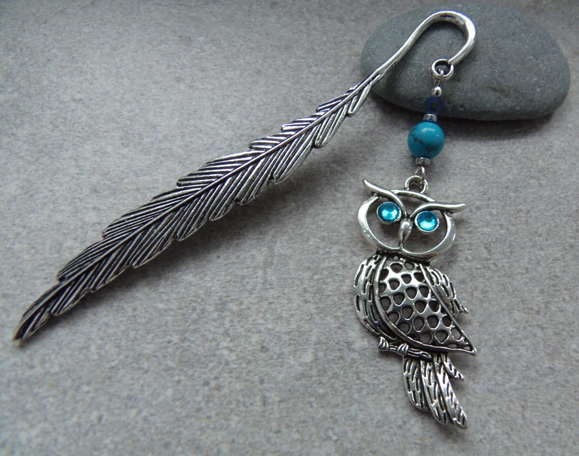 Zakładka do książki z sową o turkusowych oczach, kamieniem turkusu i kryształkiem bicone.