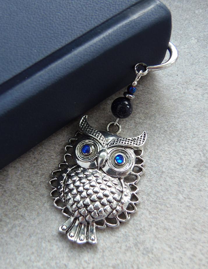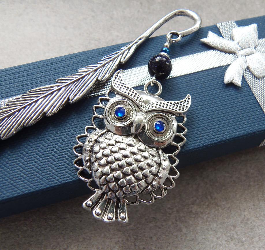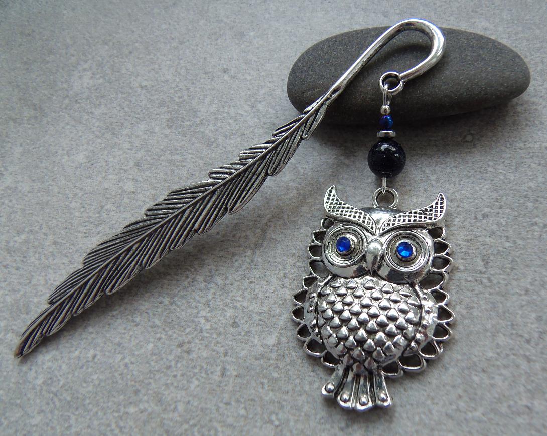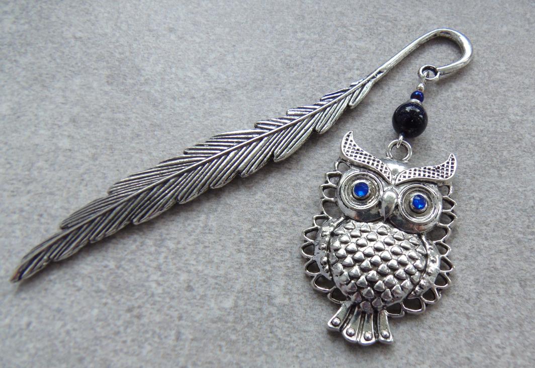 Zakładka metalowa ma kształt pióra, którego ozdobą jest piękna duża SOWA z kamieniem nocy kairu 8mm, oraz małą kulką hematytu niebieskiego.