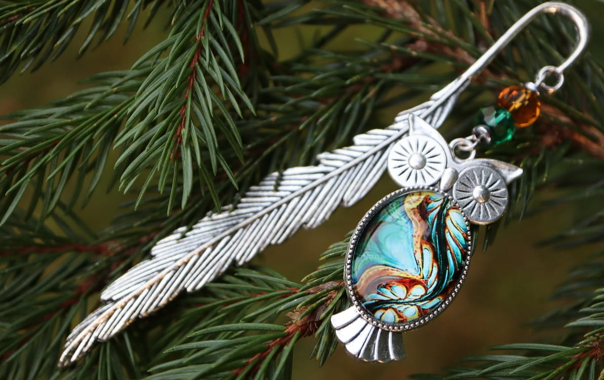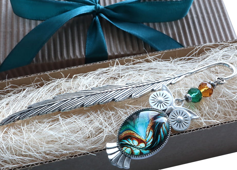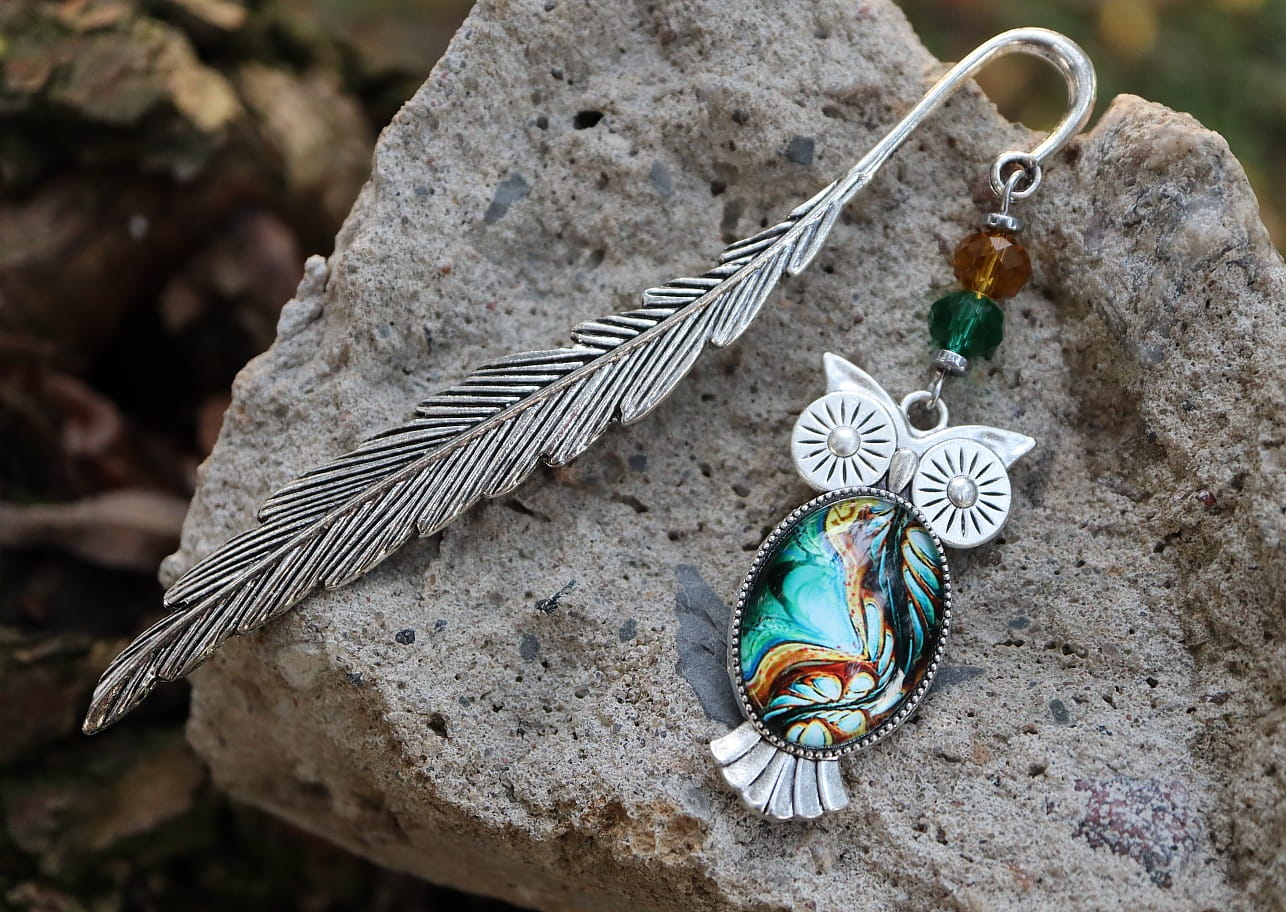 Zakładka do książki, kalendarza, notesu z piękną, oryginalną sową i kolorystycznie dopasowanymi kryształkami.