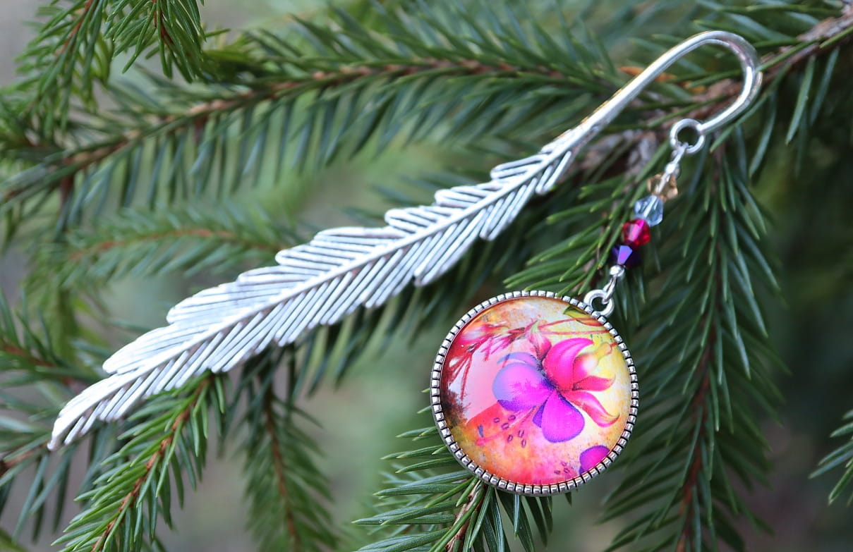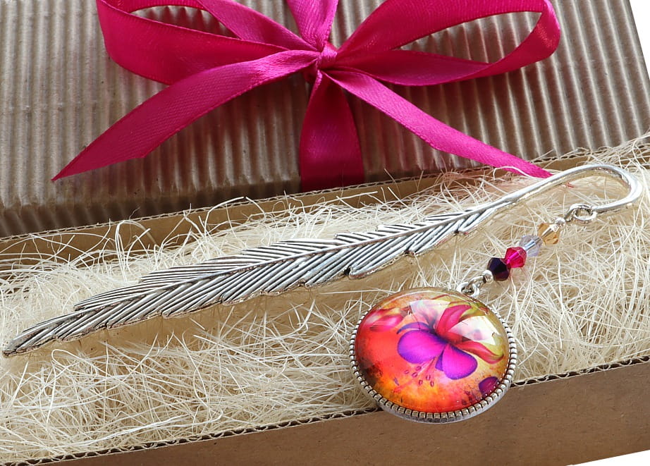 Zakładka do książki, kalendarza, notesu z pięknym, szklanym, kwiatowym kaboszonem- storczykiem.