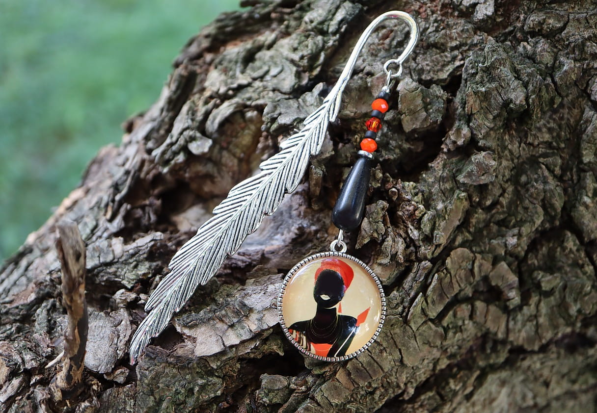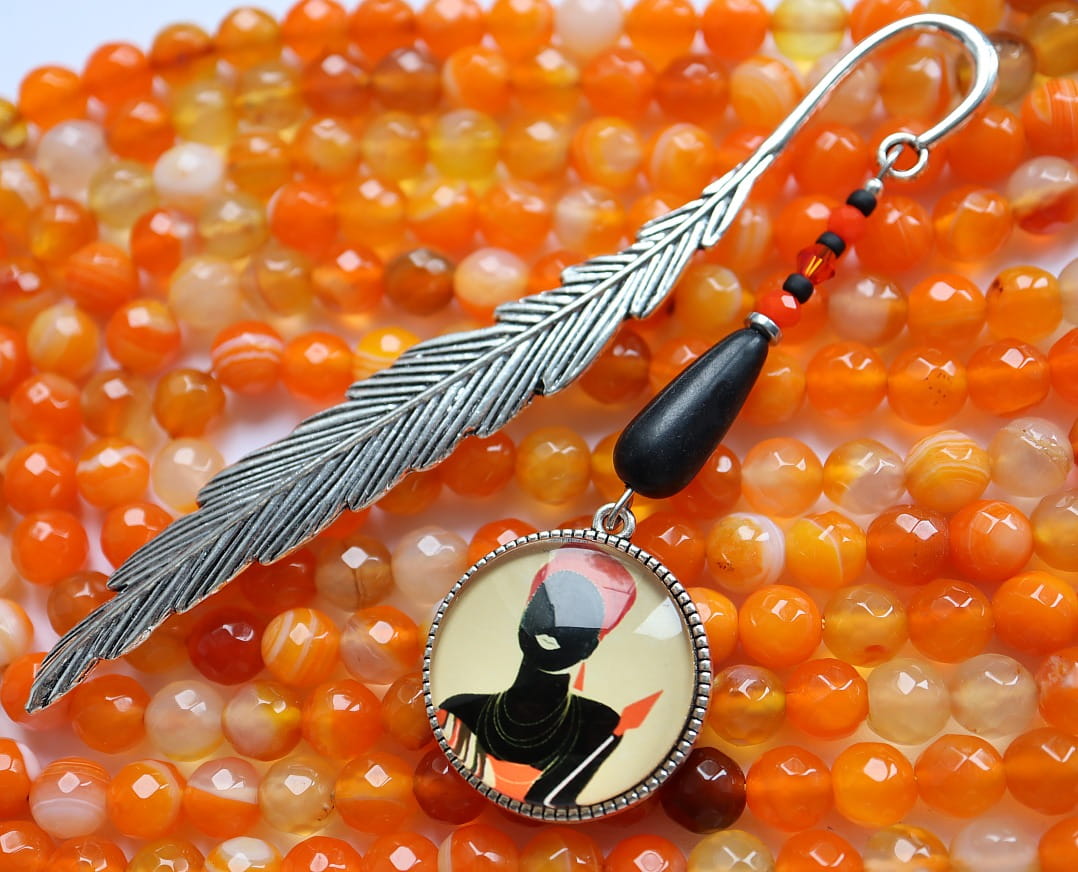 Zakładka ma kształt pióra o długości ok 12cm. Ozdobą jest Afrykanka z czarnym soplem howlitu i małymi, szklanymi kryształkami.