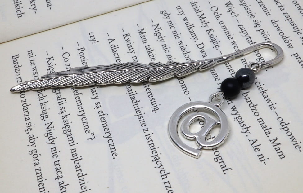 Eleganckie pióro w kolorze srebra, ozdobione charakterystycznym znakiem internetowym małpy (at), symbolizującym świat cyfrowych technologii i nieograniczonych możliwości.