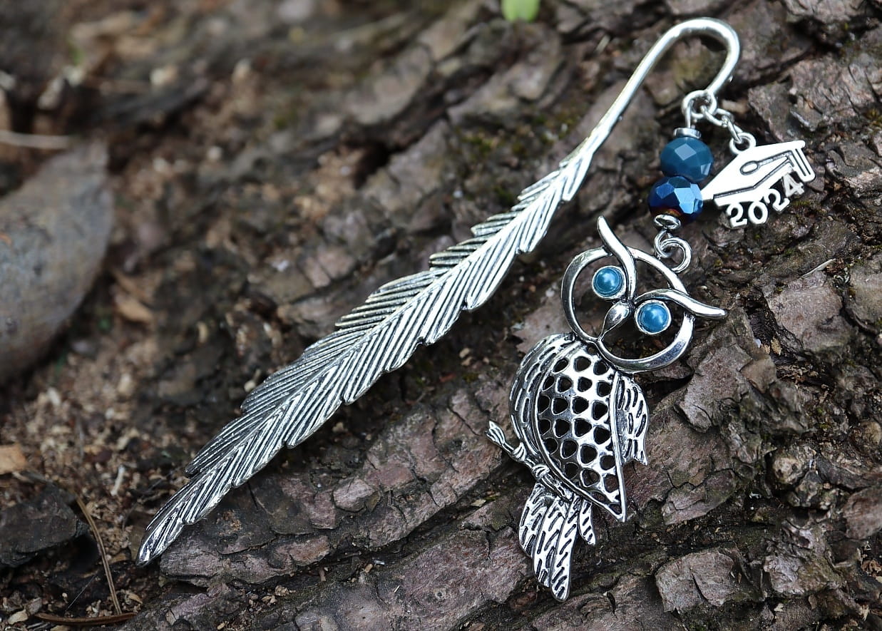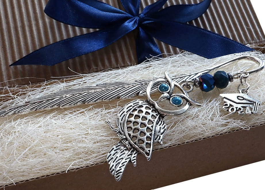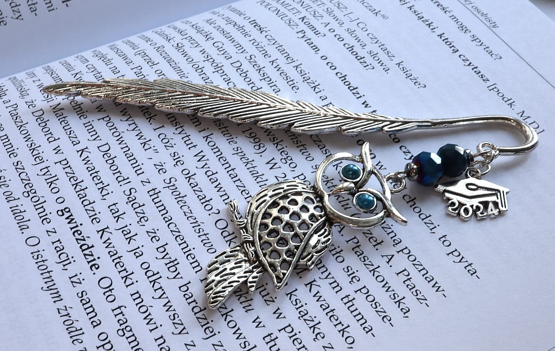 Ozdobą zakładki jest urocza sowa na gałązce, oraz biret z rokiem 2025.