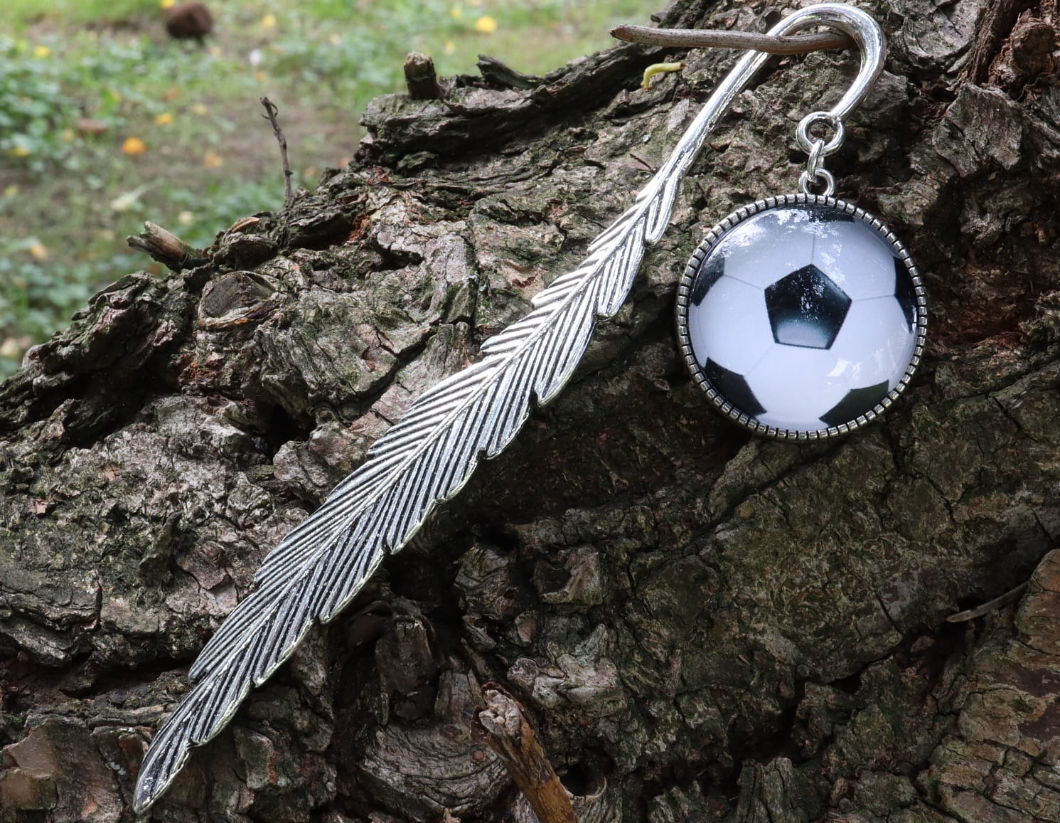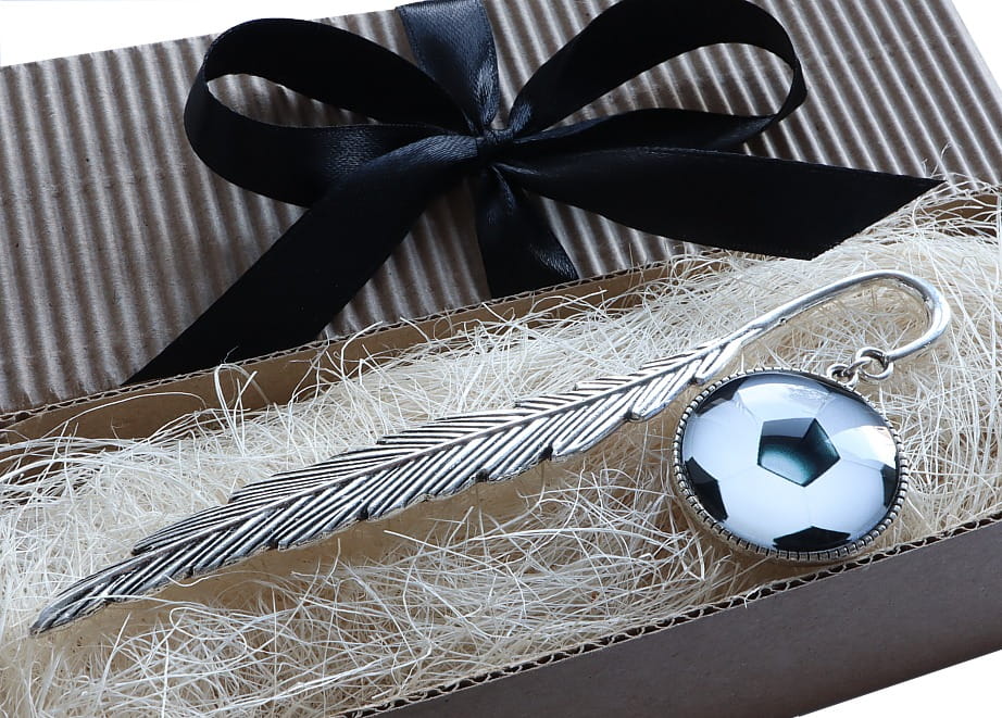Zakładka ma kształt pióra o długości ok 12cm. Ozdobą jest szklany kaboszon z piłką nożną.