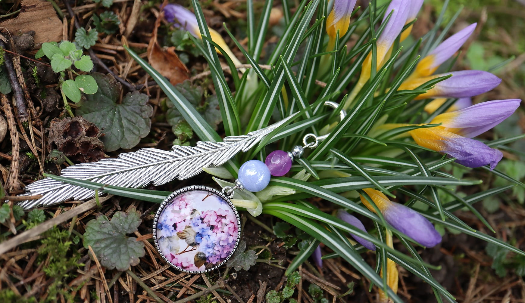 - Elegancki szklany kaboszon z przepięknym motywem hortensji w ładnych kolorach.